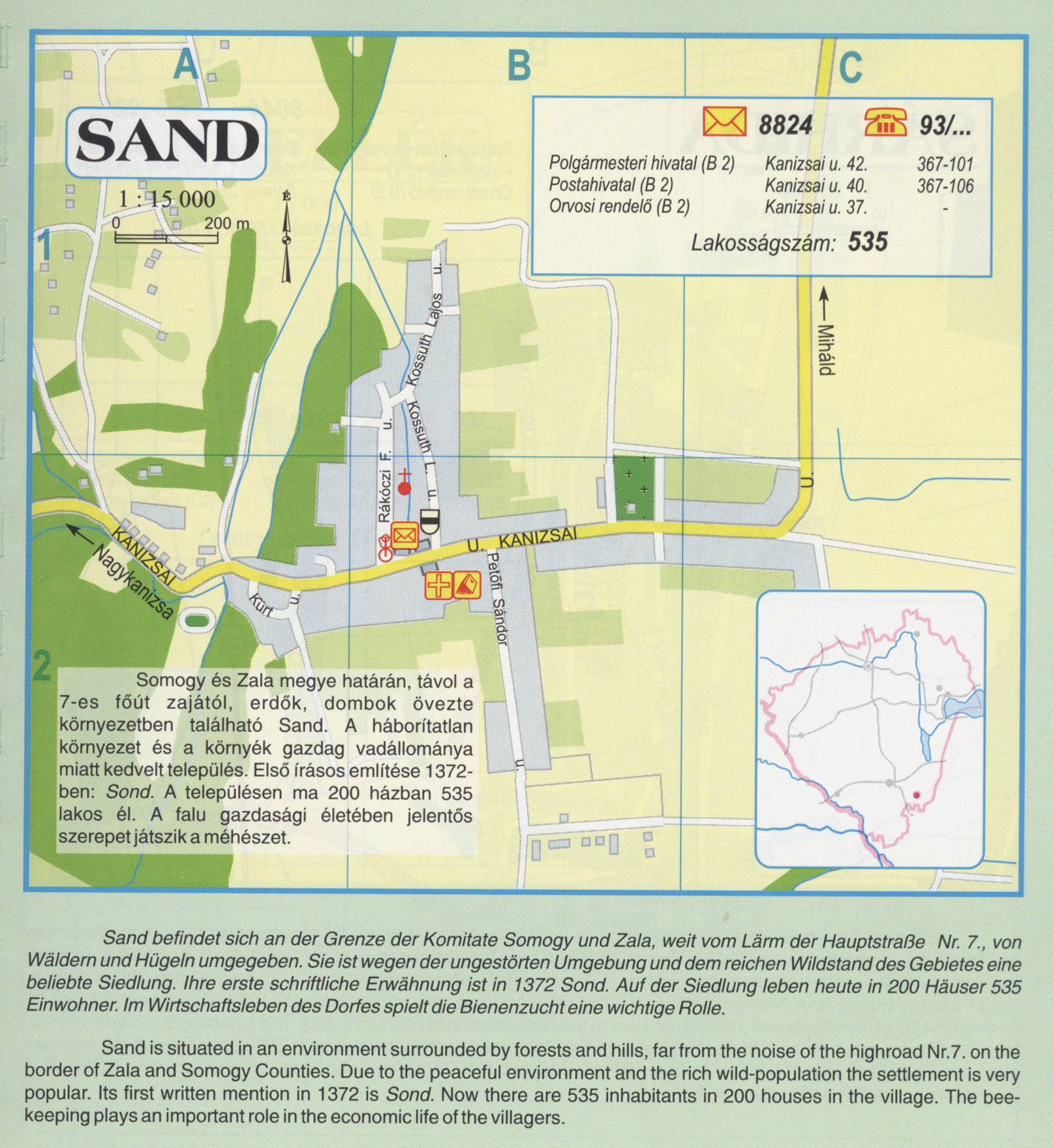 Nyilvános 2521 | 9423 | Sand | Somogy és Zala megye határán, távol a 7-es főút zajától, erdők, dombok övezte környezetben található Sand. A háborítatlan környezet és a környék gazdag vadállománya miatt kedvelt település. Első írásos említése 1372-ben: Sond. A településen ma 200 házban 535 lakos él. A falu gazdasági életében jelentős szerepet játszik a méhészet. Sand befindet sich an der Grenze der Komitate Somogy und Zala, weit vom Lärm der Hauptstraße Nr. 7., von Wäldern und Hügeln umgegeben. Sie ist wegen der ungestörten Umgebung und dem reichen Wildstand des Gebietes eine beliebte Siedlung. Ihre erste schriftliche Erwähnung ist in 1372 Sond. Auf der Siedlung leben heute in 200 Häuser 535 Einwohner. Im Wirtschaftsleben des Dorfes spielt die Bienenzucht eine wichtige Rolle. Sand is situated in an environment surrounded by forests and hills, far from the noise of the highroad Nr.7. on the border of Zala and Somogy Counties. Due to the peaceful environment and the rich wild-population the settlement is very popular. Its first written mention in 1372 is Sond. Now there are 535 inhabitants in 200 houses in the village. The bee-keeping plays an important role in the economic life of the villagers. A részlet a következő kiadványból származik/Die Teile stammen vom volgenden Buch/This text came from the following book: Cím/Titel/Title: Zala megye településeinek atlasza - 257 település részletes térképe/Atlas der Komitat Zala - 257 Detailte Siedlungskarten/Zala county\'s Atlas - 257 settlement maps. Közreműködő/contributor: Lackner László (1943) (fotó) Kiadás/Ausgabe/Publisher: Gyula : HISZI-MAP, 1997 Sorozat/Serie/Series: Indulástól - megérkezésig... ETO: 912(439.121-2) ; 908.439.121 Cutter: Z 19 ISBN: 963-610-025-4 Oldalszám/Seiten/Pages: 323, 81 p. Megjegyzés/Note: Lezárva/Abgeschlossen am/Closed am: 1997. máj. 30. |
