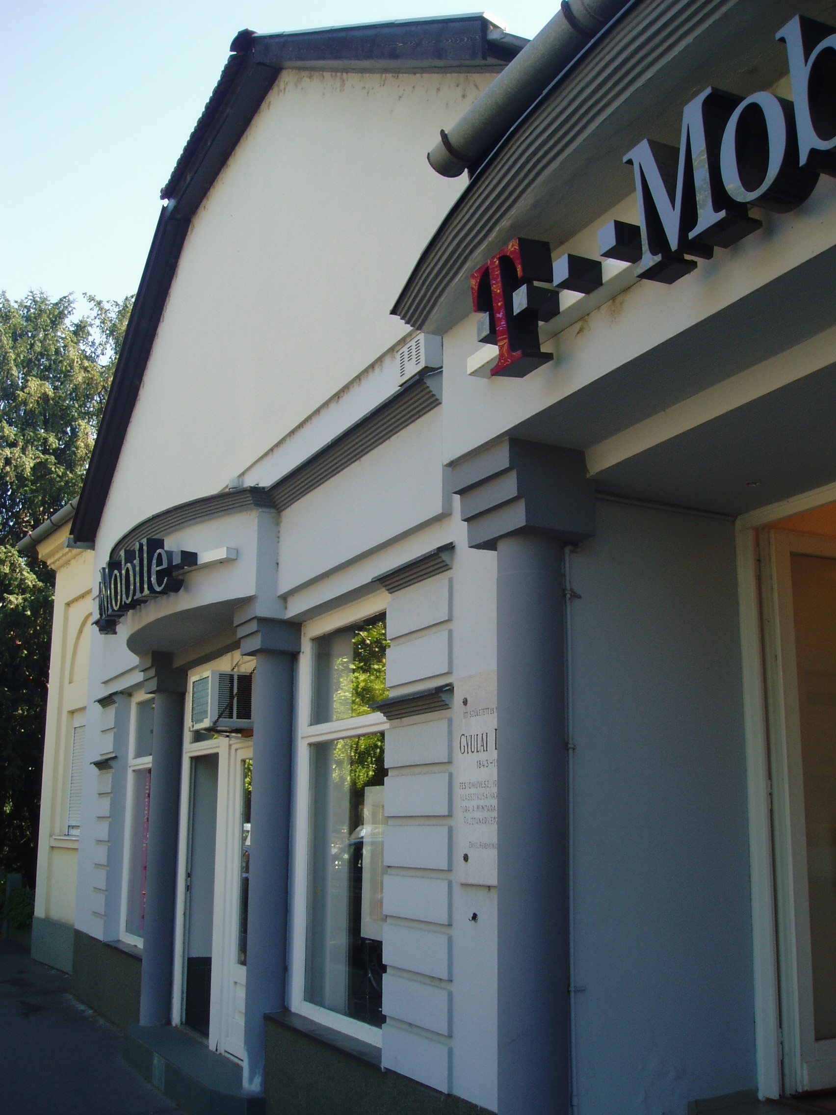 Nyilvános 1435 | 2968 | Gyula, Béke sugárút 4. | Az Élővíz csatornán átívelő hídon túl álló épületen emléktábla jelzi, hogy ebben a házban született Gyulai László (1833-1911) festőművész, Munkácsy barátja (eredeti neve Kratochvill László volt.) 1861-ben ismerkedtek meg, amikor Munkácsy - akkor még Lieb Miska - Gyulán élt (lásd: Gyula, Munkácsy u. 15.). Együtt jártak Karl Fisherhez rajzórákat venni (lásd: Gyula, Petőfi tér 5.). Barátságuk Munkácsy távozása után sem szűnt meg. Ösztöndíjjal a müncheni festészeti akadémiára kerültek, ahol együtt is laktak. Amikor pedig a már világhírűvé vált Munkácsy Gyulán járt, meglátogatta a Kratochvill családot is. Gyulai László itthon rajztanárként dolgozott és mint illusztrátor vált ismertté. A fénykép 2007 júliusában készült. Felh. irod.: Czeglédi Imre: Gyula útikalauz. 2. bőv. kiad. Gyula, 1995 |