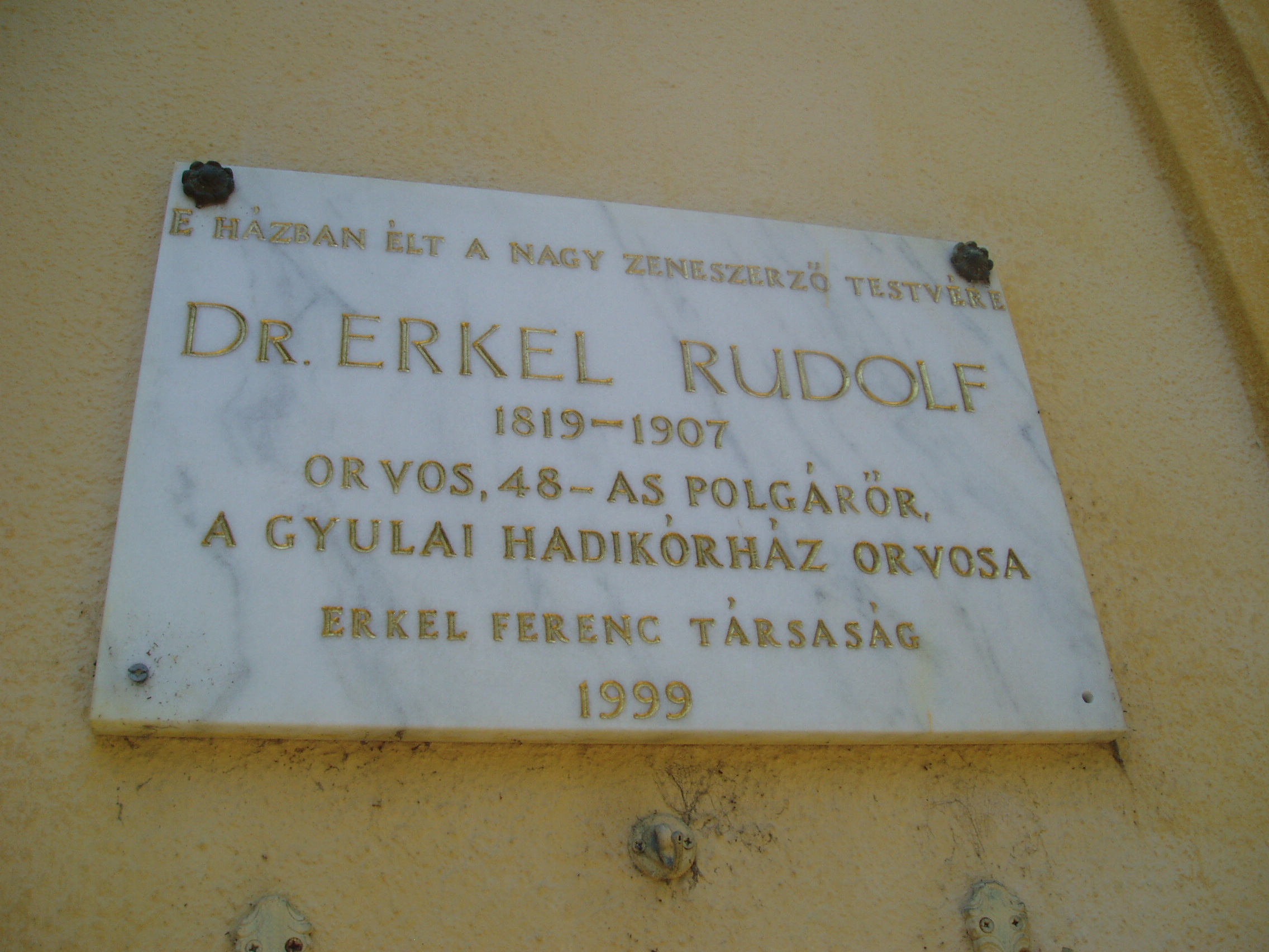 Nyilvános 1083 | 1661 | Gyula, Kossuth utca 30. | Az Almásy-kastélyhoz vezető kőhíddal egyvonalban, az utca túlsó oldalán álló földszintes lakóház egykor Erkel Rezső (Rudolf) vármegyei főorvos, Erkel Ferenc öccse lakása volt, ahol a zeneköltő is gyakran megfordult (János testvérük a szomszédban, a mai 28. szám alatt lakott). Jókai Mór két ízben is megfordult a házban. Először Laborfalvy Rózával 1848. augusztus 29-én kötött házasságuk után voltak a ház vendégei (Erkel Rezső korábban a Nemzeti Színház orvosa volt, onnét ismerték egymást). 1849 júliusában, a szabadságharc vége felé Jókai, Pestről elmenekülve az Erkel család vendégszeretetére bízta feleségét, akivel együtt volt a kor kiváló operaénekesnője, Schodelné Klein Róza is, akik a ház két udvari szobájában húzták meg magukat. Ide tért vissza Jókai feleségéért a világosi fegyverletétel után. Erről szól "Egy napom Gyulán" című szívszorító írása: "Ez volt életem legszomorúbb napja. 1849. augusztus 13-án nyitottam be a gyulai Erkel ház ajtaján ezzel a szóval: nincsen hazánk”. Jókai innét utazott álöltözetben, hamis papírokkal Tardonára. 1860-tól haláláig ebben a házban élt Erkel Ferencné Ádler Adél, miután különvált férjétől. Gyulán hunyt el, sírja a Szentháromság-temetőben van. Az épületen Erkel Rudolf, Ádler Adél és Jókai Mór emlékét márványtáblákon örökítették meg. A fénykép 2007 júliusában készült. Felh. irod.: Czeglédi Imre: Gyula útikalauz. 2. jav., bőv. kiad. Gyula, 1995 |