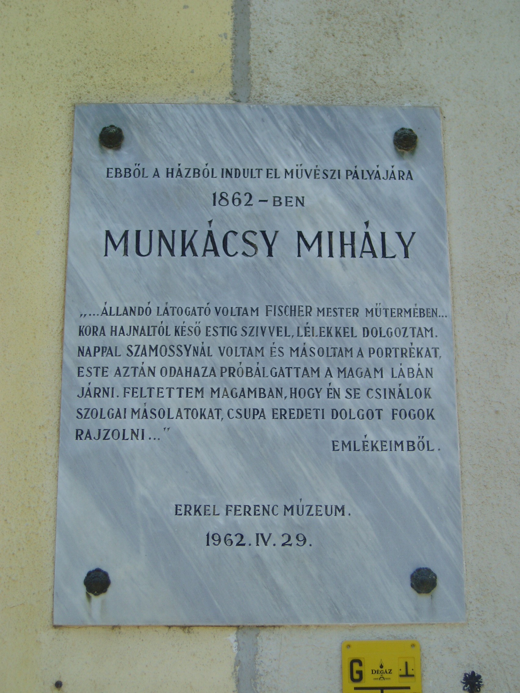 Nyilvános 1048 | 1541 | Gyula, Munkácsy utca 15. | Ebben a földszintes házban - Oláh György asztalosmester egykori házában - lakott 1860-61-ben Reök István, Munkácsy Mihály nagybátyja és gyámja. A Bach-rendszer bukása után ugyanis mint régi negyvennyolcas a megyénél kapott állást, s Gyulára költözött (korábban Békéscsabán élt). Az Aradon asztaloslegényként dolgozó gyámfia, akkor még Lieb Mihály 1860 őszén őhozzá jött haza Gyulára. A sokáig váltólázban szenvedő fiút nagybátyja Karl Fischer helybeli rajztanár műtermében taníttatta, hogy az asztalosmesterséghez szükséges rajztudást elsajátítsa. S itt, Fischer mesternél látta meg őt a Wenckheim kastélyban (lásd: Gyula, Kossuth u. 15.) tartózkodó Szamossy Elek festőművész, aki felismerte Munkácsy tehetségét, magához vette, s Gyuláról távozván, a nagybácsi engedélyével magával is vitte. Így mentette meg a tehetséges fiút a magyar művészet számára. Munkácsy maga is azt vallja önéletírásában, hogy élete sorsa Gyulán dőlt el. A ház falán márványtábla őrzi Munkácsy emlékét, s ezen idézetet olvashatunk Munkácsy "Emlékeimből" című önéletrajzából. A fénykép 2007 júliusában készült. Felh. irod.: Czeglédi Imre: Gyula útikalauz. 2. jav., bőv. kiad. Gyula, 1995 |