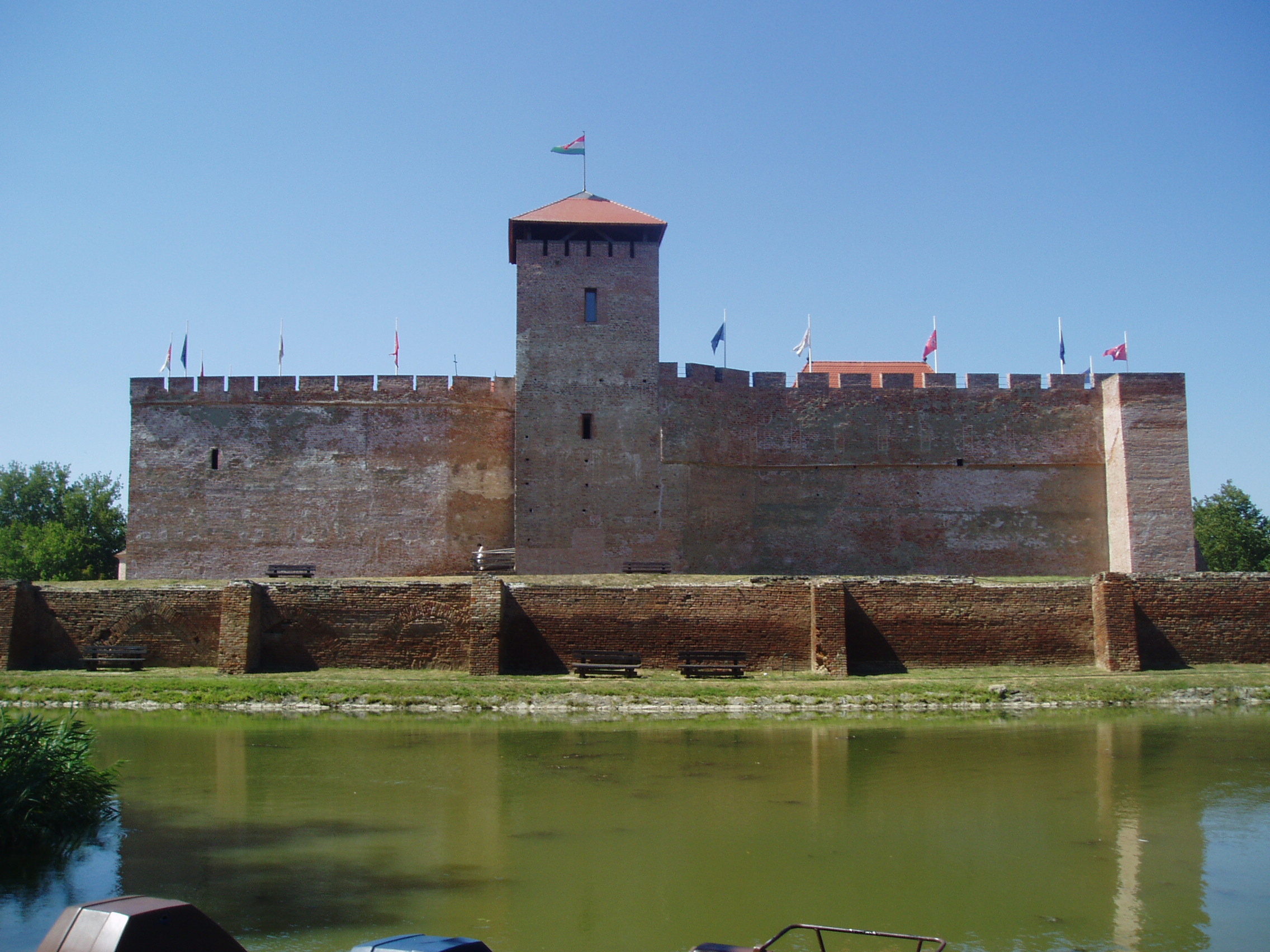 Nyilvános 1052 | 1521 | Gyula, Vár | Az Alföld egyetlen középkori téglavárát a Maróthy család építtette a XV. század első felében. Derékvárának saroktornyát 1482 után Corvin János emeltette (ma eszpresszó és borozó működik benne). Corvin János, mint a trónöröklésből kiszorított herceg 1482 és 1504 között volt a vár ura, s feleségével, Frangepán Beatrix-szel együtt gyakran tartózkodott itt. Corvin János 150-ben bekövetkezett halála után özvegye állandóan Gyulán lakott. 1508-ban itt halt meg leánya, Corvin Erzsébet, a Hunyadi család utolsó sarja. 1543-ban a vár történelmi esemény színhelye volt: itt tartott közös országgyűlést Fráter György elnökletével az Erdéllyel határos nyolc alföldi megye nemessége. 1552-től a vár a török elleni végvári rendszer láncszeme lett és ó-olasz bástyás palánkvárrá alakították át. 1566-ban került török kézre, miután erősítés hiányában, kilenc heti ostrom után Kerecsényi László kapitány kénytelen volt feladni. Bár a török szabad elvonulást ígért, a maradék védőket a janicsárok megtámadták és lemészárolták, Kerecsényi kapitányt pedig foglyul ejtették és Nándorfehérváron kivégezték. A vár 1695-ig volt török kézen. Akkori állapotát megörökítette leírásában Evlia Cselebi török világutazó. A Rákóczi-szabadságharc után az ún. huszárvárat lerombolták, csak a belső vár maradt meg. Az épület déli sarkán Tóth Béla: Végvári vitéz című lovas szobra áll. A vár két bejárata közül a délkeleti oldalon van az ún. Kerecsényi kapu. A boltíve alatti két helyiségben a helyi hagyomány szerint Damjanich János és Lahner György tábornok volt elszállásolva 1849 augusztusában. A várudvar 1964 óta a Gyulai Várszínház előadásainak színhelye. A belső termekben a közelmúltban nyílt meg a Vármúzeum. A vár előtt az egykori vizesárok kiszélesítésével csónakázótavat létesítettek, melynek közepén tószínpadot alakítottak ki. A fénykép 2007 júliusában készült. Felh. irod.: Czeglédi Imre: Gyula útikalauz. 2. jav., bőv. kiad. Gyula, 1995 www.vendegvaro.hu www.gyula.hu |