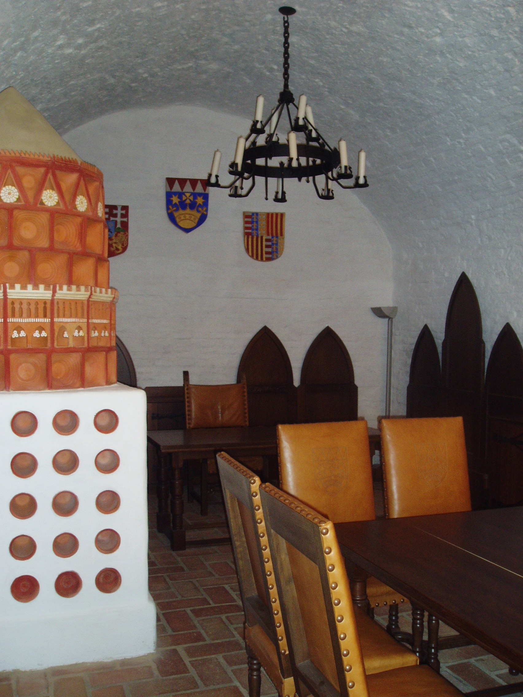 Nyilvános 1052 | 1595 | Gyula, Vár | A vár belső termeiben a közelmúltban nyílt meg a Vármúzeum. Berendezett termei és kápolnája igazi korabeli hangulatot nyújtanak a látogatóknak. A képen az emeleten található lovagterem részlete látható egy XVI. századi kályha rekonstrukciójával. A fénykép 2007 júliusában készült. |