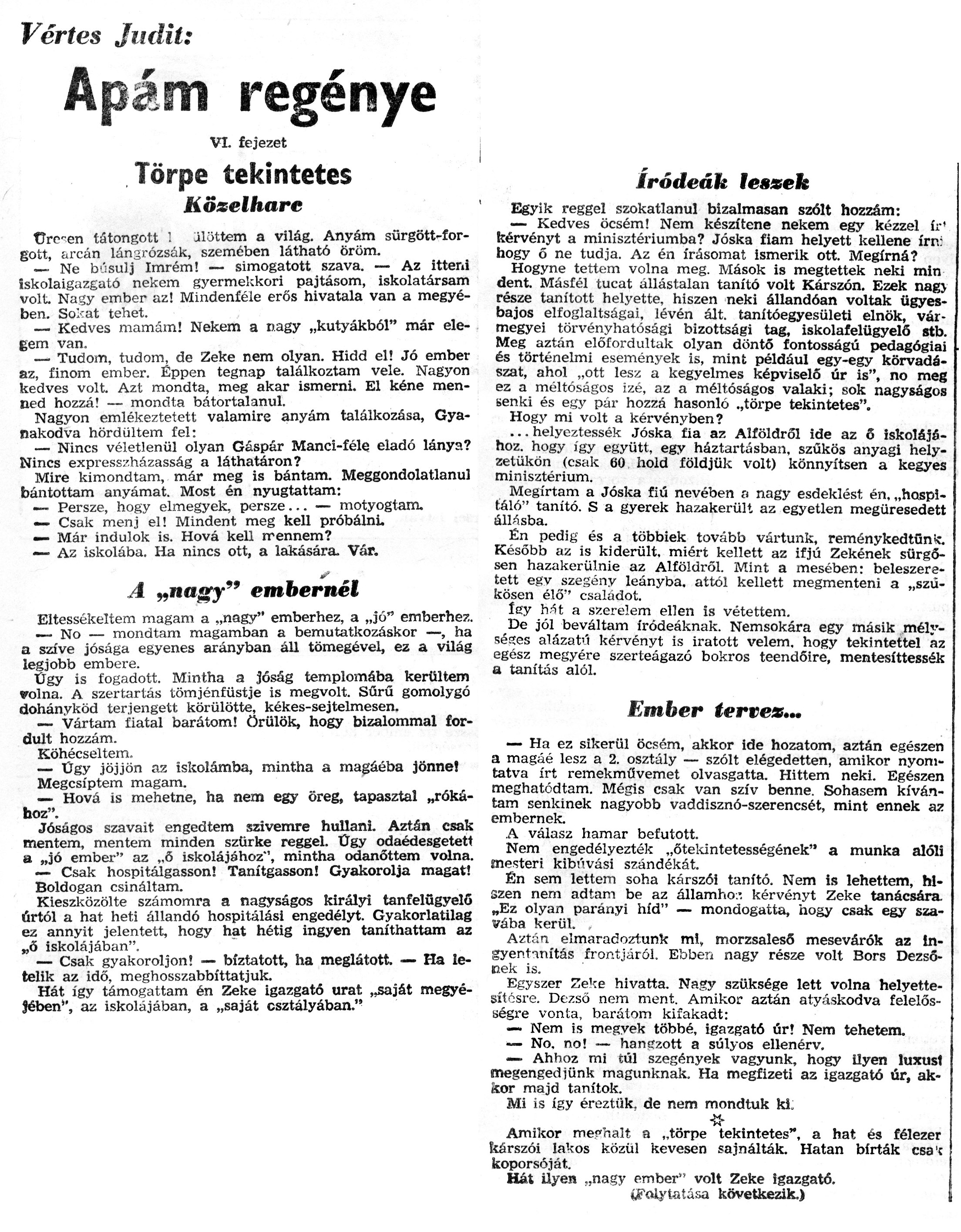 Nyilvános 1155 | 2194 | Zalai Hírlap 1971.01.24. 020sz 08old - Apám regénye 04 | A következő szöveg a cikkből keletkezett automata szövegfelismertető segítségével: Vértes Judit: Apám regénye VI. fejezet Törpe tekintetes {■ Közelharc ürc-en tátongott ! jlöttem a világ. Anyám sürgött-for-gott, arcán lángrózsák, szemében látható öröm. — Ne búsulj Imrém! — simogatott szava. — Az itteni iskolaigazgató nekem gyermekkori pajtásom, iskolatársam volt Nagy ember az! Mindenféle erős hivatala van a megyében. So\'^at tehet. ..... __ Kedves mamám! Nekem a nagy „kutyákból" mar elegem van. __Tudom, tudom, de Zeke nem olyan. Hidd el! Jó ember az, finom ember. Éppen tegnap találkoztam vele. Nagyon kedves volt. Azt mondta, meg akar ismerni. El kéne menned hozzá! — mondta bátortalanul. Nagyon emlékeztetett valamire anyám találkozása, Gyanakodva hördültem fel: — Nincs véletlenül olyan Gáspár Manci-féle eladó lánya? Nincs expresszházasság a láthatáron? Mire kimondtam, már meg is bántam. Meggondolatlanul bántottam anyámat. Most én nyugtattam: __ Persze, hogy elmegyek, persze... — motyogtam. — Csak menj el! Mindent meg kell próbálni. — Már indulok is. Hová kell rrennem? — Az iskolába. Ha nincs ott, a lakására. Vár. __ \' A „nagy" embernél Eltessékeltem magam a „nagy" emberhez, a „jó" emberhez. __ No — mondtam magamban a bemutatkozáskor —, ha a szíve jósága egyenes arányban áll tömegével, ez a világ legjobb embere. | Ügy is fogadott. Mintha a jóság templomába kerültem volna. A szertartás tömjénfüstje is megvolt. Sűrű gomolygó dohányköd terjengett körülötte, kékes-sejtelmesen. — Vártam fiatal barátom! örülök, hogy bizalommal fordult hozzám. Köhécseltem. — Ügy jöjjön az iskolámba, mintha a magáéba jönne! Megcsíptem magam. — Hová is mehetne, ha nem egy öreg, tapasztal „rókához". Jóságos szavait engedtem szivemre hullani. Aztán csak mentem, mentem minden szürke reggel. Ügy odaédesgetett a „jó ember" az „6 iskolájához", mintha odanőttem volna. — Csak hospitálgasson! Tanítgasson! Gyakorolja magát! Boldogan csináltam. Kieszközölte számomra a nagyságos királyi tanfelügyelő úrtól a hat heti állandó hospitálási engedélyt. Gyakorlatilag ez annyit jelentett, hogy hat hétig ingyen taníthattam az „ő iskolájában". — Csak gyakoroljon! — bíztatott, ha meglátott. — Ha letelik az idő, meghosszabbíttatjuk. Hát így támogattam én Zeke igazgató urat „saját megyéjében", az iskolájában, a „saját osztályában." íródeák lessek Egyik reggel szokatlanul bizalmasan szólt hozzám: — Kedves öcsém! Nem készítene nekem egy kézzel ír\' kérvényt a minisztériumba? Jóska fiam helyett kellene írn: hogy ő ne tudja. Az én írásomat ismerik ott. Megírná? Hogyne tettem volna meg. Mások is megtettek neki min dent. Másfél tucat állástalan tanító volt Kárszón. Ezek nag> része tanított helyette, hiszen neki állandóan voltak ügyesbajos elfoglaltságai, lévén ált. tanítóegyesületi elnök, vármegyei törvényhatósági bizottsági tag, iskolafelügyelő stb. Meg aztán előfordultak olyan döntő fontosságú pedagógiai és történelmi események is, mint például egy-egy körvadászat, ahol „ott lesz a kegyelmes képviselő úr is", no meg ez a méltóságos izé, az a méltóságos valaki; sok nagyságos senki és egy pár hozzá hasonló ..törpe tekintetes". Hogy mi volt a kérvényben? ... helyeztessék Jóska fia az Alföldről ide az ő iskolájához, hogy így együtt, egy háztartásban, szűkös anyagi helyzetükön (csak 60 hold földjük volt) könnyítsen a kegyes minisztérium. Megírtam a Jóska fiú nevében a nagy esdeklést én. „hospl-táló" tanító. S a gyerek hazakerült az egyetlen megüresedett állásba. Én pedig és a többiek tovább vártunk, reménykedtünk Később az is kiderült, miért kellett az ifjú Zekének sürgősen hazakerülnie az Alföldről. Mint a mesében: beleszeretett egv szegény leányba, attól kellett megmenteni a „szűkösen élő" csaladot. íey h.-ít a szerelem ellen is vétettem. De jól beváltam íródeáknak. Nemsokára egy másik mélységes alázat\'í kérvényt is íratott velem, hogy tekintettel az egész megyére szerteágazó bokros teendőire, mentesíttessék a tanítás alól. Ember tertex... — Ha ez sikerül öcsém, akkor ide hozatom, aztán egészen a magáé lesz a 2. osztály — szólt elégedetten, amikor nyomtatva írt remekművemet olvasgatta. Hittem neki. Egészen meghatódtam. Mégis csak van szív benne. Sohasem kívántam senkinek nagyobb vaddisznó-szerencsét, mint ennek az embernek. A válasz hamar befutott. Nem engedélyezték „őtekintetességének" a munka alóli mesteri kibúvási szándékát. Én sem lettem soha kárszói tanító. Nem is lehettem, hiszen nem adtam be az államho:\'. kérvényt Zeke tanácsára. „Ez olyan parányi híd" — mondogatta, hogy csak egy szavába kerül. Aztán elmaradoztunk ml, morzsaleső mesevárók az in-gyentnnítás frontjáról. Ebben nagy része volt Bors Dezsőnek is. Egyszer "eke hivatta. Nagy szüksége lett volna helyettesítésre. Dezső nem ment. Amikor aztán atyáskodva felelősségre vonta, barátom kifakadt: — Nem is megyek többé, igazgató úr! Nem tehetem. — No. no! — hangzott a súlyos ellenérv. •— Ahhoz mi túl szegények vagyunk, hogy ilyen luxust megengedjünk magunknak. Ha megfizeti az igazgató úr, ak-ísor majd tanítok. Mi is így éreztük, de nem mondtuk ki: Amikor me«"nalt a „törpe tekintetes", a hat és félezer kárszói lakos közül kevesen sajnálták. Hatan bírták csa\'c koporsóját. Hát ilyen „nagy ember" volt Zeke igazgató. (Folytatása következik.) |