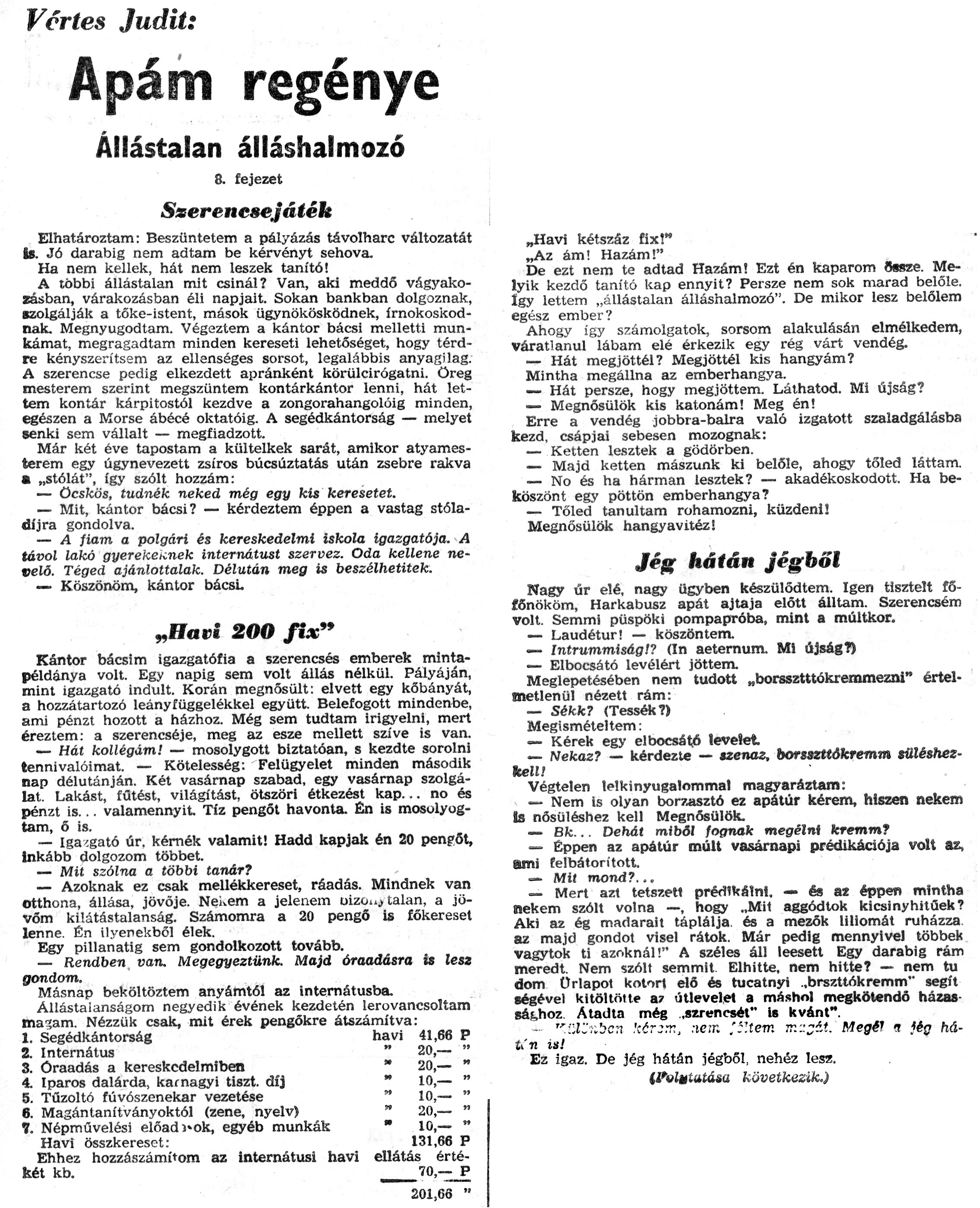 Nyilvános 1193 | 2204 | Zalai Hírlap 1971.02.21. 044sz 08old - Apám regénye 08 | A következő szöveg a cikkből keletkezett automata szövegfelismertető segítségével: Vertes Judit: Apám regénye Állástalan álláshalmozó 8. fejezet Szerencsejáték Elhatároztam: Beszüntetem a pályázás távolharc változatát is. Jó darabig nem adtam be kérvényt sehova. Ha nem kellek, hát nem leszek tanító! A többi állástalan mit csinál? Van, aki meddő vágyakozásban, várakozásban éli napjait. Sokan bankban dolgoznak, szolgálják a tőke-istent, mások ügynökösködnek, írnokoskod-nak. Megnyugodtam. Végeztem a kántor bácsi melletti munkámat, megragadtam minden kereseti lehetőséget, hogy térdre kényszerítsem az ellenséges sorsot, legalábbis anyagilag. A szerencse pedig elkezdett apránként körülcirógatni. öreg mesterem szerint megszűntem kontárkántor lenni, hát lettem kontár kárpitostól kezdve a zongorahangolóig minden, egészen a Morse ábécé oktatóig. A segédkántorság — melyet senki sem vállalt — megfiadzott. Már két éve tapostam a kültelkek sarát, amikor atyamesterem egy úgynevezett zsíros búcsúztatás után zsebre rakva a „stólát", így szólt hozzám: — Öcskös, tudnék neked még egy kis keresetet. — Mit, kántor bácsi? — kérdeztem éppen a vastag stóla-díjra gondolva. — A fiam a polgári és kereskedelmi iskola igazgatója. A távol lakó gyerekéinek internátust szervez. Oda kellene nevelő. Téged ajánlottalak. Délután meg is beszélhetitek. — Köszönöm, kántor bácsi. „Havi 200 fix" Kántor bácsim igazgatófia a szerencsés emberek mintapéldánya volt. Egy napig sem volt állás nélkül. Pályáján, mint igazgató indult. Korán megnősült: elvett egy kőbányát, a hozzátartozó leányfüggelékkel együtt. Belefogott mindenbe, ami pénzt hozott a házhoz. Még sem tudtam irigyelni, mert éreztem: a szerencséje, meg az esze mellett szíve is van. — Hát kollégám! — mosolygott biztatóan, s kezdte sorolni tennivalóimat. — Kötelesség: Felügyelet minden második nap délutánján. Két vasárnap szabad, egy vasárnap szolgálat. Lakást, fűtést, világítást, ötszöri étkezést kap... no és pénzt is... valamennyit Tíz pengőt havonta. Én is mosolyogtam, ő is. — Igazgató úr, kérnék valamit! Hadd kapjak én 20 pengőt, inkább dolgozom többet. — Mit szólna a többi tanár? — Azoknak ez csak mellékkereset, ráadás. Mindnek van otthona, állása, jövője. Nekem a jelenem üizoi»> talán, a jö-vőm kilátástalanság. Számomra a 20 pengő is főkereset lenne. Én ilyenekből élek. Egy pillanatig sem gondolkozott tovább. — Rendben van. Megegyeztünk. Majd óraadásra is lesz gondom. Másnap beköltöztem anyámtól az internátusba. Állástalanságom negyedik évének kezdetén lerovancsoltam ma?am. Nézzük csak, mit érek pengőkre átszámítva: 1. Segédkán torság havi 41,66 P 2. Internátus " 20,— " 3. Óraadás a kereskedelmiben " 20,— " 4. Iparos dalárda, karnagyi tiszt, díj " 10,— " 5. Tűzoltó fúvószenekar vezetése " 10,— " 6. Magántanítványoktól (zene, nyelv) " 20,— " 7. Népművelési előad )-ok, egyéb munkák " 10,— " Havi összkereset: 131,66 P Ehhez hozzászámítom az internátusi havi ellátás értékét kb. 70,— P \'\'\' 201,63 " „Havi kétszáz fix!" „Az ám! Hazám!" De ezt nem te adtad Hazám! Ezt én kaparom Sssze. Melyik kezdő tanító kap ennyit? Persze nem sok marad belőle. Így lettem „állástalan álláshalmozó". De mikor lesz belőlem egész ember? Ahogy így számolgatok, sorsom alakulásán elmélkedem, Váratlanul lábam elé érkezik egy rég várt vendég. — Hát megjöttél? Megjöttél kis hangyám? Mintha megállna az emberhangya. — Hát persze, hogy megjöttem. Láthatod. Mi újság? — Megnősülök kis katonám! Meg én! Erre a vendég jobbra-balra való izgatott szaladgálásba kezd, csápjai sebesen mozognak: — Ketten lesztek a gödörben. — Majd ketten mászunk ki belőle, ahogy tőled láttam. — No és ha hárman lesztek? — akadékoskodott. Ha beköszönt egy pöttön emberhangya? — Tőled tanultam rohamozni, küzdeni! Megnősülök hangyavitéz! - Jég hátán jégből Nagy úr elé, nagy ügyben készülődtem. Igen tisztelt fő-főnököm, Harkabusz apát ajtaja előtt álltam. Szerencsém volt. Semmi püspöki pompapróba, mint a múltkor. — Laudétur! — köszöntem. — Intrummiság!? (In aeternum. Mi újság?) — Elbocsátó levélért jöttem. Meglepetésében nem tudott „borssztttókrernmezni" értelmetlenül nézett rám: — Séfcfc? (Tessék?) Megismételtem: — Kérek egy elboesátő levelet — Nekaz? — kérdezte — szenaz, borsszttökremm sütéshez-kell! Végtelen lelkinyugalommal magyaráztam: > — Nem is olyan borzasztó ez apátúr kérem, hiszen nekem Is nősüléshez kell Megnősülök. — Bk... Dehát miből fognak megélni kremm? — Éppen az apátúr múlt vasárnapi prédikációja volt az, ami felbátorított — Mit mond?... — Mert azt tetszeti prédikálni, — és 82 éppen mintha nekem szólt volna —, hogy „Mit aggódtok kicsinyhitűek? Aki az ég madarait táplálja, és a mezők liliomát ruházza. az majd gondot visel rátok. Már pedig mennyivel többek vagytok ti azoknál!" A széles áll leesett Egy darabig rám meredt. Nem szólt semmit. Elhitte, nem hitte? — nem tu dom Űrlapot kotort elő és tucatnyi ..brszttókremnV segít ségével kitöltötte az útlevelet a máshol megkötendő házassághoz. Átadta még „szreneset" is kvánt". - "::i:-;.bc:i kir:T., :iem ,\'í\'tem ir.::-áí. Megél <i )ég háti n is! Ez igaz. De jég hátán jégből, nehéz lesz. következik.) |