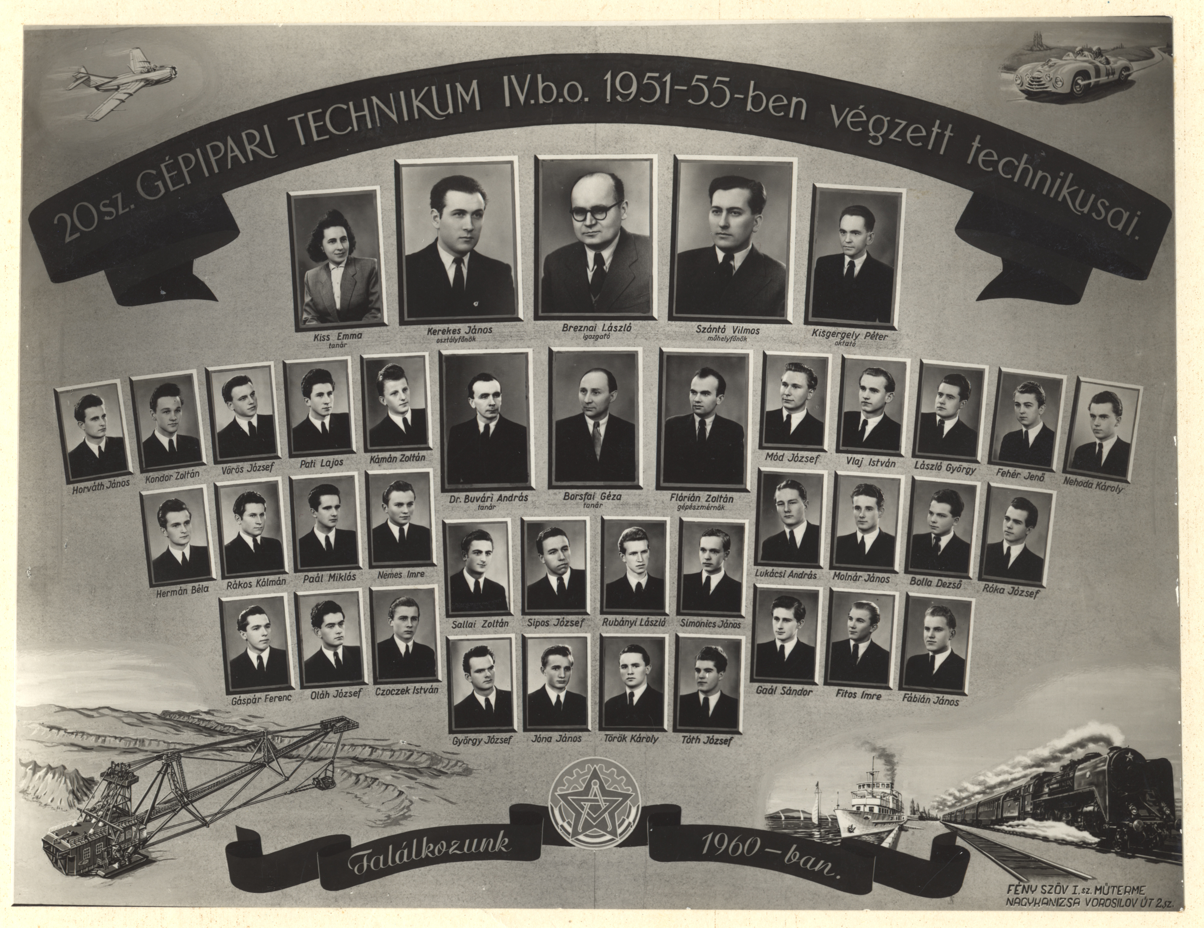 Nyilvános 1368 | 2440 | 20 sz. Gépipari Technikum IV.b.o. 1951-55-ben végzett technikusai | Borsfai Géza tanár Breznai László igazgató Buvári András dr. tanár Flórián Zoltán gépészmérnök Kerekes János osztályfőnök Kisgergely Péter oktató Kiss Emma tanár Szántó Vilmos műhelyfőnök Bolla Dezső Czoczek István Fábián János Fehér Jenő Fitos Imre Gaál Sándor Gáspár Ferenc György József Hermán Béla Horváth János Jóna János Kámán Zoltán Kondor Zoltán László György Lukácsi András Mód József Molnár János Nehoda Károly Nemes Imre Oláh József Paál Miklós Pati Lajos Rákos Kálmán Róka József Rubányi László Sallai Zoltán Simonics János Sipos József Tóth József Török Károly Vlaj István Vörös József |