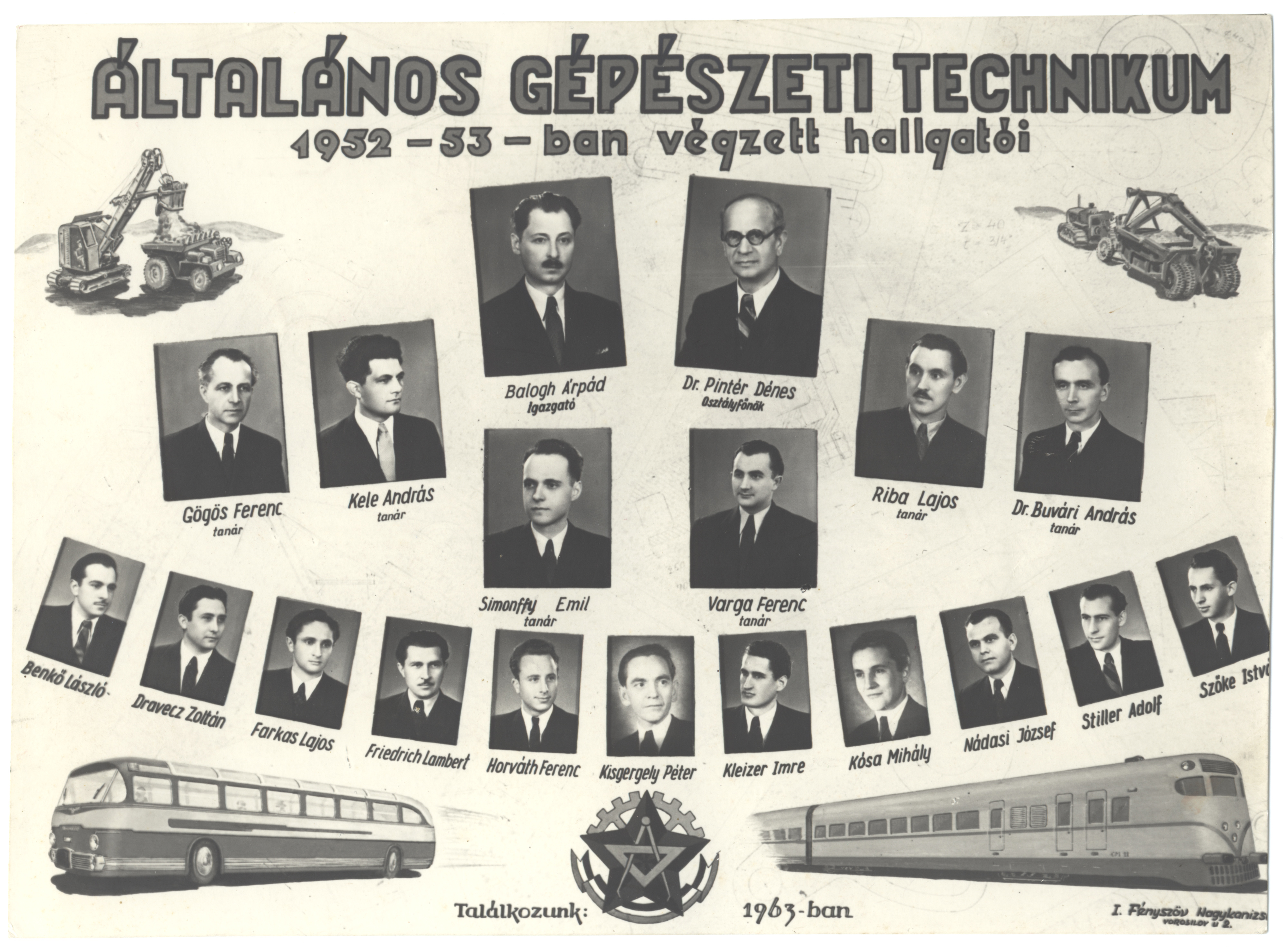 Nyilvános 1473 | 3032 | Általános Gépészeti Technikum 1952-53-ban végzett hallgatói | Balogh Árpád igazgató Buvári András dr. tanár Gögös Ferenc tanár Kele András tanár Pintér Dénes dr. osztályfőnök Riba Lajos tanár Simonffy Emil tanár Varga Ferenc tanár Benkő László Dravecz Zoltán Farkas Lajos Friedrich Lambert Horváth Ferenc Kisgergely Péter Kleizer Imre Kósa Mihály Nádasi József Stiller Adolf Szőke István |