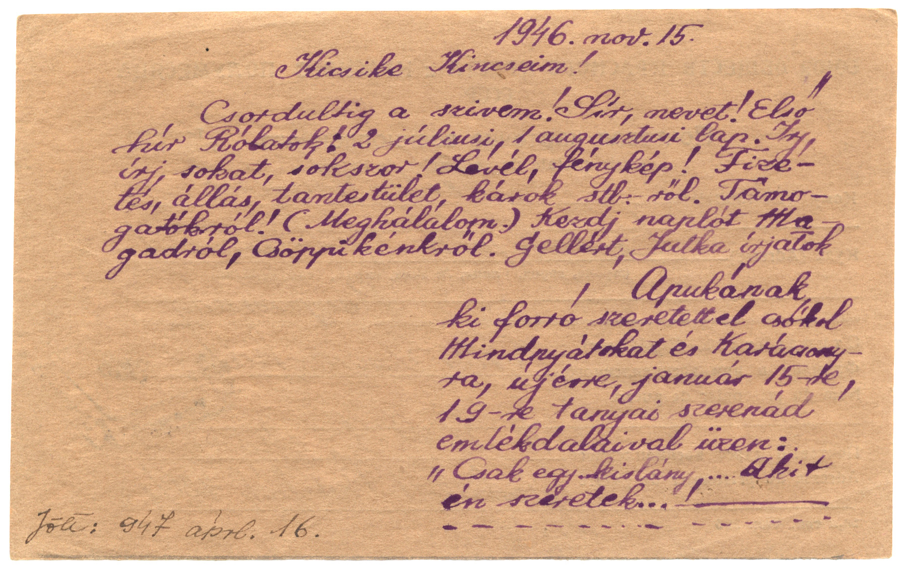Nyilvános 1386 | 2550 | Vértes Imréné | Letenye IV. /Zala vm./ Magyarország Vértes Imre hdgy. U.R.S.S. "Moszkva" Vöröskereszt, Postafiók 430/1. c. 1946. nov. 15. Kicsike Kincseim! Csordultig a szívem! Sír, nevet! Első hír Rólatok: 2 júliusi, 1 augusztusi lap. Írj, írj sokat, sokszor! Levél, fénykép! Fizetés, állás, tantestület, káros stb.-ről. Támogatókról! (Meghálálom.) Kezdj naplót Magadról, Csöppikénkről. Gellért, Jutka írjatok Apukának ki forró szeretettel csókol Mindnyátokat és Karácsonyra, újévre, január 15-re, 19-re tanyai szerenád emlékdalaival üzen: "Csak egy kislány, ... akit én szeretek...!" Jött: 1947 áprl. 16. |