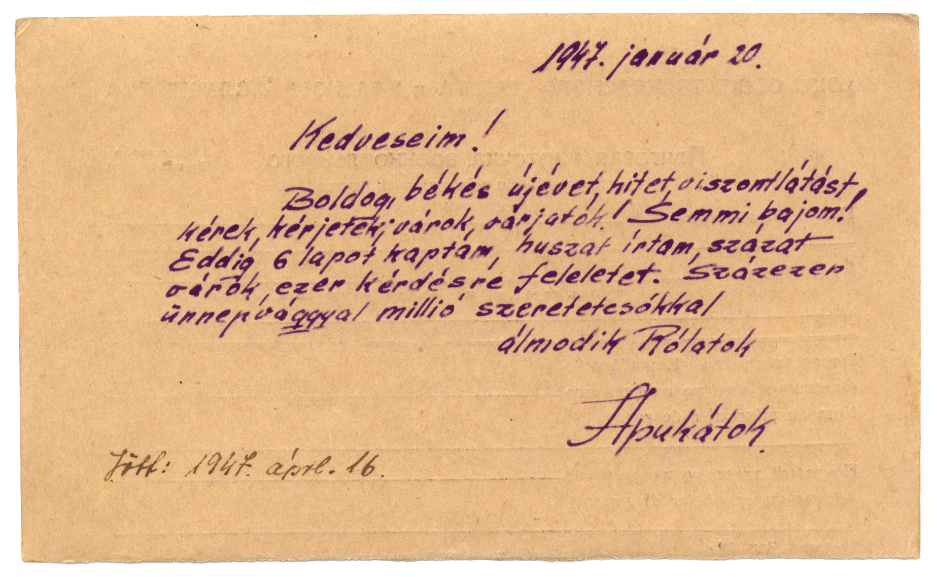 Nyilvános 1349 | 2358 | Vértes Imréné | Letenye IV. - Zala vm. Magyarország Vértes Imre hdgy. ... C.C.C.P. "Moszkva" Vöröskereszt, Postafiók 430/1. c. ... 1947. január 20. Kedveseim! Boldog, békés újévet, hitet, viszontlátást kérek, kérjetek; várok, várjatok! Semmi bajom! Eddig 6 lapot kaptam, huszat írtam, százat várok, ezer kérdésre feleletet. Százezer ünnepvággyal millió szeretetcsókkal álmodik Rólatok Apukátok Jött: 1947. áprl. 16. |