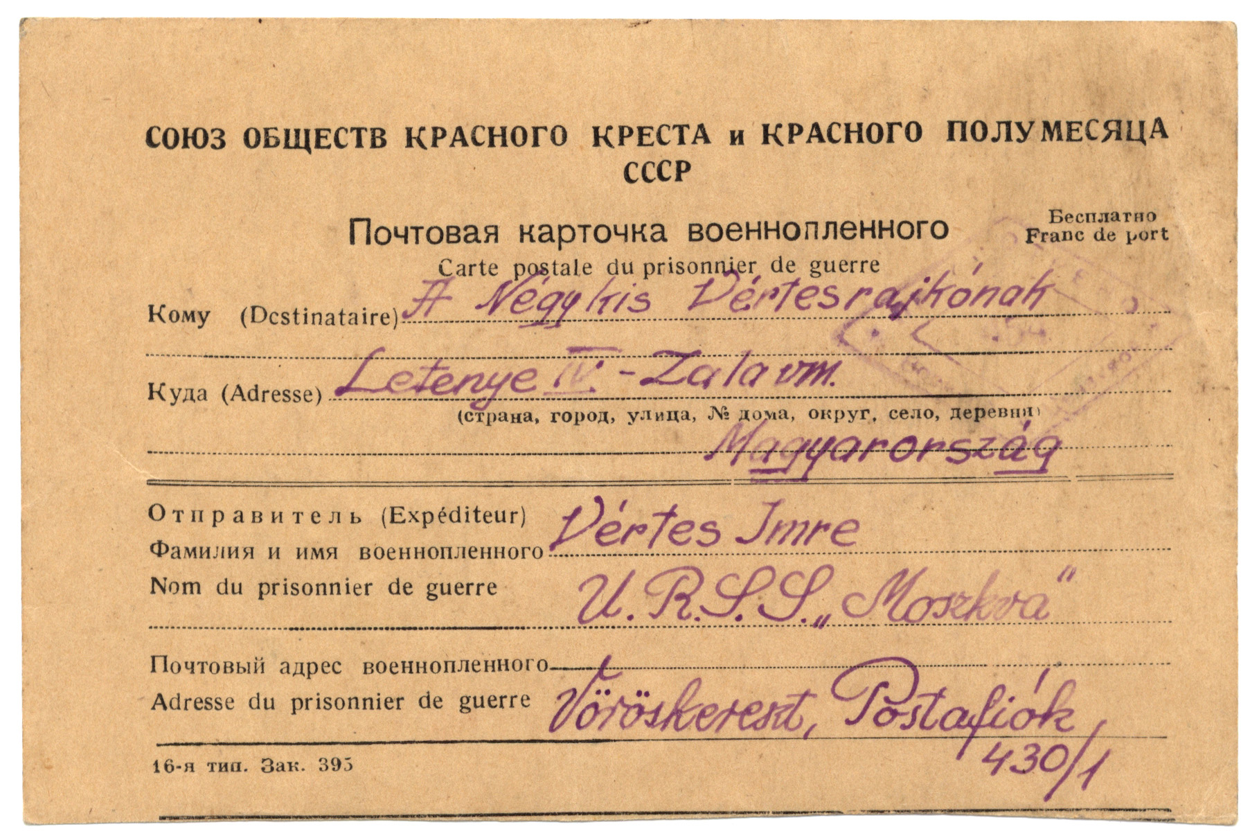 Nyilvános 1329 | 2320 | A Négy kis Vértesrajkónak | Letenye IV. - Zala vm. Magyarország Vértes Imre U.R.S.S. "Moszkva" Vöröskereszt, Postafiók 430/1. c. 1947. II. 10. Kicsiny fészek, benn négy fecske, Élő fészek élő kincse: Négy fióka; négy kis lélek Gellért, Jutka, bennem éltek, Eszter, Györgyi: Kicsi fecskék, Rátok szállnak álomlepkék Attól, akit hazavártok, Éj-nap, aki gondol Rátok. Messzeszakadt Apukátok |