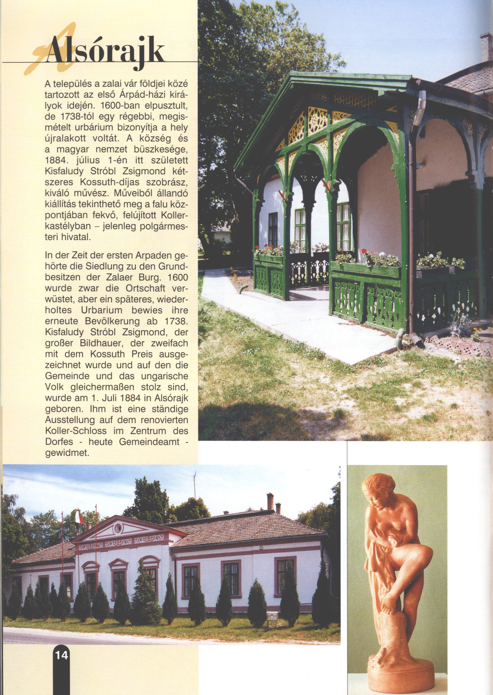 Nyilvános 2106 | 6124 | Alsórajk | In der Zeit der ersten Arpaden gehörte die Siedlung zu den Grundbesitzen der Zalaer Burg. 1600 wurde zwar die Ortschaft verwüstet, aber ein späteres, wiederholtes Urbarium bewies ihre erneute Bevölkerung ab 1738. Kisfaludy Stróbl Zsigmond, der großer Bildhauer, der zweifach mit dem Kossuth Preis ausgezeichnet wurde und auf den die Gemeinde und das ungarische Volk gleichermaßen stolz sind, wurde am 1. Juli 1884 in Alsórajk geboren. Ihm ist eine ständige Ausstellung auf dem renovierten Koller-Schloss im Zentrum des Dorfes - heute Gemeindeamt -gewidmet. Dieses Text stammt von: Titel: Hívogató a Régiók Kapujában - Útikönyv Látnivalók Nagykanizsán és Térségében (Einladend in dem Tor des Gebiets - Reisebuch - Sehenswürdigkeiten in Nagykanizsa und Umgebung) Herausgegeben von: Nagykanizsa és a Környező Települések Területfejlesztési Társulása (Verein für Gebietsentwicklung in Nagykanizsa und in ihrer Umgebung) 8800 Nagykanizsa, Petőfi Sándor út 5. Tel.: 06 93/536-453 • 06 93/536-454 Tel ./Fax: 06 93/326-323 E-mail: terstars@axelero.hu www.kanizsaterseg.celodin.hu |