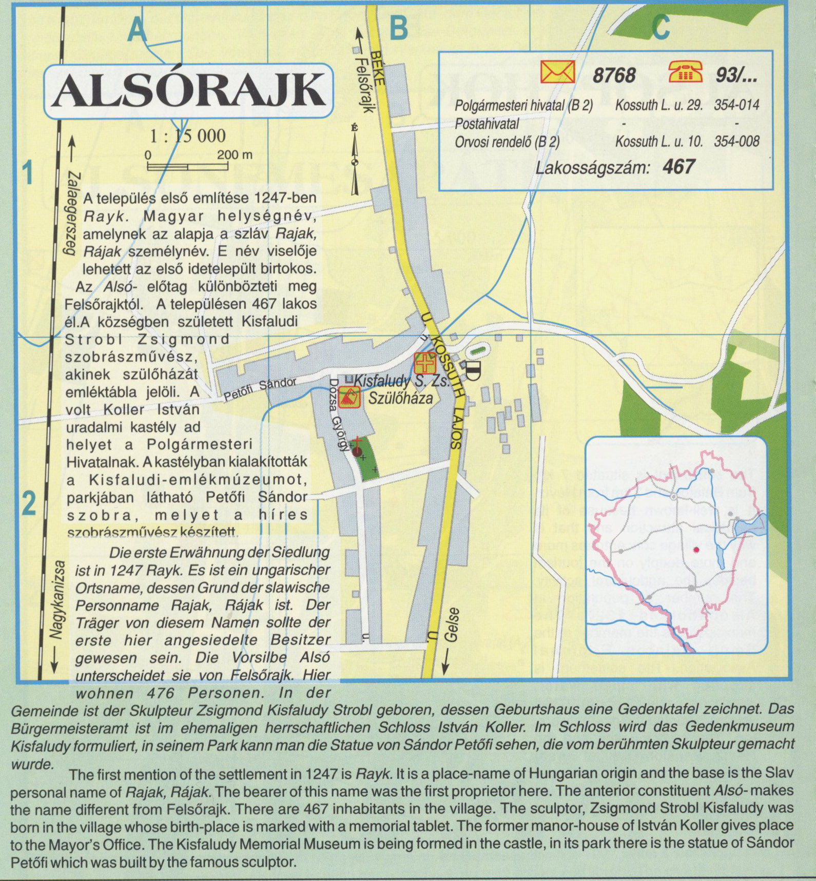 Nyilvános 2193 | 9080 | Alsórajk | A település első említése 1247-ben Rayk. Magyar helységnév, amelynek az alapja a szláv Rajak, Rájak személynév. E név viselője lehetett az első idetelepült birtokos. Az Alsó- előtag különbözteti meg Felsőrajktól. A településen 467 lakos él. A községben született Kisfaludi Stróbl Zsigmond szobrászművész, akinek szülőházát emléktábla jelöli. A volt Koller István uradalmi kastély ad helyet a Polgármesteri Hivatalnak. A kastélyban kialakították a Kisfaludi-emlékmúzeumot, parkjában látható Petőfi Sándor szobra, melyet a híres szobrászművész készített. Die erste Erwähnung der Siedlung ist in 1247 Rayk. Es ist ein ungarischer Ortsname, dessen Grund der slawische Personname Rajak, Rájak ist. Der Träger von diesem Namen sollte der erste hier angesiedelte Besitzer gewesen sein. Die Vorsilbe Alsó- unterscheidet sie von Felsőrajk. Hier wohnen 476 Personen. In der Gemeinde ist der Skulpteur Zsigmond Kisfaludy Stróbl geboren, dessen Geburtshaus eine Gedenktafel zeichnet. Das Bürgermeisteramt ist im ehemaligen herrschaftlichen Schloss István Koller. Im Schloss wird das Gedenkmuseum Kisfaludy formuliert, in seinem Park kann man die Statue von Sándor Petőfi sehen, die vom berühmten Skulpteur gemacht wurde. The first mention of the settlement in 1247 is Rayk. It is a place-name of Hungarian origin and the base is the Slav personal name of Rajak, Rájak. The bearer of this name was the first proprietor here. The anterior constituent Alsó- makes the name different from Felsőrajk. There are 467 inhabitants in the village. The sculptor, Zsigmond Strobl Kisfaludy was born in the village whose birth-place is marked with a memorial tablet. The former manor-house of István Koller gives place to the Mayor\'s Office. The Kisfaludy Memorial Museum is being formed in the castle, in its park there is the statue of Sándor Petőfi which was built by the famous sculptor. A részlet a következő kiadványból származik/Die Teile stammen vom volgenden Buch/This text came from the following book: Cím/Titel/Title: Zala megye településeinek atlasza - 257 település részletes térképe/Atlas der Komitat Zala - 257 Detailte Siedlungskarten/Zala county\'s Atlas - 257 settlement maps. Közreműködő/contributor: Lackner László (1943) (fotó) Kiadás/Ausgabe/Publisher: Gyula : HISZI-MAP, 1997 Sorozat/Serie/Series: Indulástól - megérkezésig... ETO: 912(439.121-2) ; 908.439.121 Cutter: Z 19 ISBN: 963-610-025-4 Oldalszám/Seiten/Pages: 323, 81 p. Megjegyzés/Note: Lezárva/Abgeschlossen am/Closed am: 1997. máj. 30. |