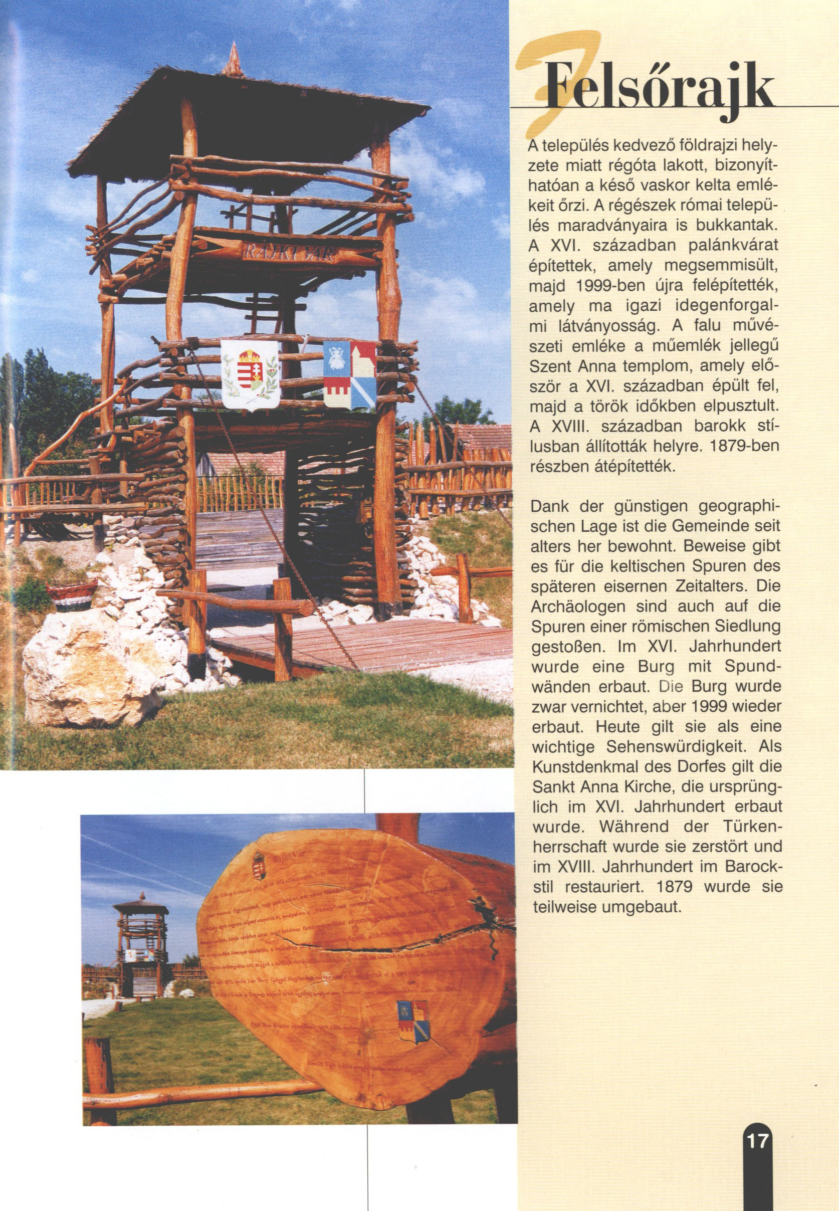 Nyilvános 2282 | 6328 | Felsőrajk | Dank der günstigen geographischen Lage ist die Gemeinde seit alters her bewohnt. Beweise gibt es für die keltischen Spuren des späteren eisernen Zeitalters. Die Archäologen sind auch auf die Spuren einer römischen Siedlung gestoßen. Im XVI. Jahrhundert wurde eine Burg mit Spundwänden erbaut. Die Burg wurde zwar vernichtet, aber 1999 wieder erbaut. Heute gilt sie als eine wichtige Sehenswürdigkeit. Als Kunstdenkmal des Dorfes gilt die Sankt Anna Kirche, die ursprünglich im XVI. Jahrhundert erbaut wurde. Während der Türkenherrschaft wurde sie zerstört und im XVIII. Jahrhundert im Barockstil restauriert. 1879 wurde sie teilweise umgebaut. Dieses Text stammt von: Titel: Hívogató a Régiók Kapujában - Útikönyv Látnivalók Nagykanizsán és Térségében (Einladend in dem Tor des Gebiets - Reisebuch - Sehenswürdigkeiten in Nagykanizsa und Umgebung) Herausgegeben von: Nagykanizsa és a Környező Települések Területfejlesztési Társulása (Verein für Gebietsentwicklung in Nagykanizsa und in ihrer Umgebung) 8800 Nagykanizsa, Petőfi Sándor út 5. Tel.: 06 93/536-453 • 06 93/536-454 Tel ./Fax: 06 93/326-323 E-mail: terstars@axelero.hu www.kanizsaterseg.celodin.hu |