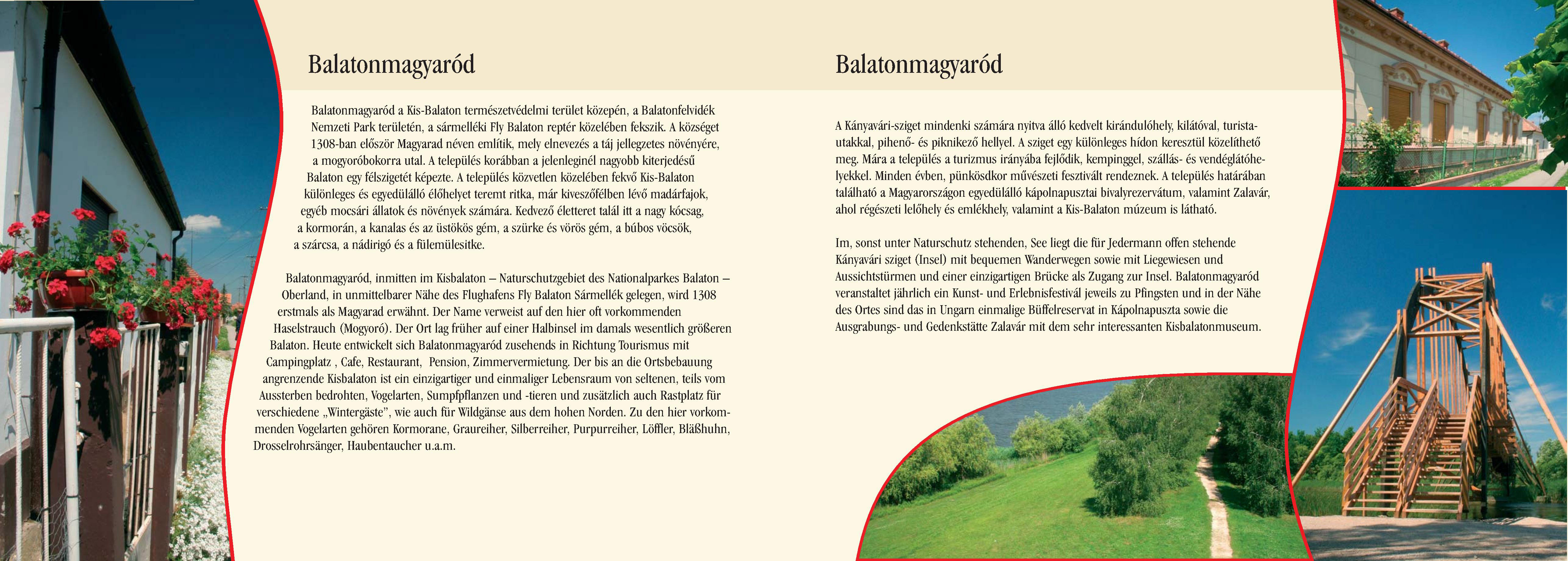 Nyilvános 2222 | 6309 | Balatonmagyaród | Balatonmagyaród, inmitten im Kisbalaton Naturschutzgebiet des Nationalparkes Balaton Oberland, in unmittelbarer Nähe des Flughafens Fly Balaton Sármellék gelegen, wird 1308 erstmals als Magyarad erwähnt. Der Name verweist auf den hier oft vorkommenden Haselstrauch (Mogyoró). Der Ort lag früher auf einer Halbinsel im damals wesentlich größeren Balaton. Heute entwickelt sich Balatonmagyaród zusehends in Richtung Tourismus mit Campingplatz , Cafe, Restaurant, Pension, Zimmervermietung. Der bis an die Ortsbebauung angrenzende Kisbalaton ist ein einzigartiger und einmaliger Lebensraum von seltenen, teils vom Aussterben bedrohten, Vogelarten, Sumpfpflanzen und -tieren und zusätzlich auch Rastplatz für verschiedene ,,Wintergäste", wie auch für Wildgänse aus dem hohen Norden. Zu den hier vorkommenden Vogelarten gehören Kormorane, Graureiher, Silberreiher, Purpurreiher, Löffler, Bläßhuhn, Drosselrohrsänger, Haubentaucher u.a.m. Im, sonst unter Naturschutz stehenden, See liegt die für Jedermann offen stehende Kányavári sziget (Insel) mit bequemen Wanderwegen sowie mit Liegewiesen und Aussichtstürmen und einer einzigartigen Brücke als Zugang zur Insel. Balatonmagyaród veranstaltet jährlich ein Kunst- und Erlebnisfestivál jeweils zu Pfingsten und in der Nähe des Ortes sind das in Ungarn einmalige Büffelreservat in Kápolnapuszta sowie die Ausgrabungs- und Gedenkstätte Zalavár mit dem sehr interessanten Kisbalatonmuseum. Dieses Text stammt von: Pannonhát tájpark prospektus 2006. Web: http://www.pannonhat.hu/ (auch in Deutsch) |