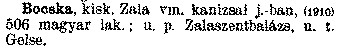 Nyilvános 2206 | 5854 | Cím: Révai nagy lexikona | Alcím: az ismeretek enciklopédiája Kiadás: Budapest : Révai testvérek, [1911]- Kötetei: 1. köt., A - Arany 2. köt., Arány - Beke 3. köt., Béke - Brutto 4. köt., Bratus - Csát 5. köt., Csata - Duc 6. köt., Duc - Etele 7. köt., Stelka - Földöv 8. köt., Földpálya - Gres 9. köt., Gréc - Herold 10. köt., Hérold - Jób 11. köt., Jób - Nontur 12. köt., Kontúr - Lovas 13. köt., Lovas - Mons 14. köt., Mens - Ottó 15. köt., Ottó - Racine 16. köt., Racine - Sodoma 17. köt., Sodoma - Tarján 18. köt., 19. köt., Vár - Zsüri | Kiegészítés Aachen - Beöthy 20. köt., Kiegészítés: Bér - Zsolt ETO jelzet: 03=945.11 Szakjelzet: 030 Cutter: R 62 Nyelv: magyar BOCSKA Bocska,kisk. Zala vm. kanizsai j.-ban, (1910) 506 magyar lak. ; u. p. Zalaszentbalázs, u. t. Gelse. |