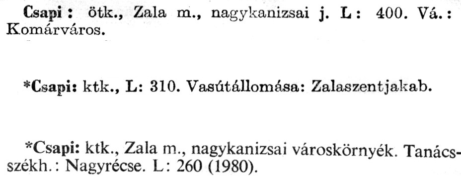Nyilvános 2353 | 6374 | A szócikkek felismertetett szövege: | (Az első csillag után az 1972-es, a második csillag után az 1981-es kiadású kiegészítő kötetből származó szöveg következik) Csapi: ötk., Zala m., nagykanizsai j. L : 400. Vá.: Komárváros. *Csapi: ktk., L: 310. Vasútállomása: Zalaszentjakab. *Csapi: ktk., Zala m., nagykanizsai városkörnyék. Tanács-székh.: Nagyrécse. L: 260 (1980). A szócikkek a következő lexikonból származnak: Cím: Új magyar lexikon Közreműködő: Berei Andor (1900-1979) (szerk.) Szerz. közl.: [szerk. Berei Andor et al.] Kiadás jelzés: 2. lny. Kiadás: Budapest : Akad. K., 1961-1962 Kötetei: 1., A - C 2., D - F 3., G - J 4., K - Me 5., Mf - R 6., S - Z 7. köt., A-Z Kiegészítő kötet (1972) Kiegészítő kötet, 1962÷1980 (1981) ETO jelzet: 03=945.11 Szakjelzet: 030 Cutter: U 28 Nyelv: magyar Megjegyzés: Bibliogr. a címszavak egy részének végén |