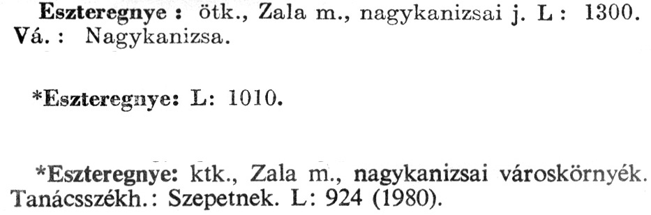 Nyilvános 2328 | 6327 | A szócikkek felismertetett szövege: | (Az első csillag után az 1972-es, a második csillag után az 1981-es kiadású kiegészítő kötetből származó szöveg következik) Eszteregnye : ötk., Zala m., nagykanizsai j. L : 1300. Vá. : Nagykanizsa. *Eszteregnye: L: 1010. *Eszteregnye: ktk., Zala m., nagykanizsai városkörnyék. Tanácsszékh.: Szepetnek. L: 924 (1980). A szócikkek a következő lexikonból származnak: Cím: Új magyar lexikon Közreműködő: Berei Andor (1900-1979) (szerk.) Szerz. közl.: [szerk. Berei Andor et al.] Kiadás jelzés: 2. lny. Kiadás: Budapest : Akad. K., 1961-1962 Kötetei: 1., A - C 2., D - F 3., G - J 4., K - Me 5., Mf - R 6., S - Z 7. köt., A-Z Kiegészítő kötet (1972) Kiegészítő kötet, 1962÷1980 (1981) ETO jelzet: 03=945.11 Szakjelzet: 030 Cutter: U 28 Nyelv: magyar Megjegyzés: Bibliogr. a címszavak egy részének végén |