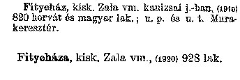 Nyilvános 2164 | 5865 | Fityeház, kisk. Zala vm. kanizsai j.-ban, (1910) 820 horvát és magyar lak. ; u. p. és u. t. Murakeresztúr. Fityeháza kisk. Zala vm. (1920) 928 lak. Cím: Révai nagy lexikona Alcím: az ismeretek enciklopédiája Kiadás: Budapest : Révai testvérek, [1911]- Kötetei: 1. köt., A - Arany 2. köt., Arány - Beke 3. köt., Béke - Brutto 4. köt., Bratus - Csát 5. köt., Csata - Duc 6. köt., Duc - Etele 7. köt., Stelka - Földöv 8. köt., Földpálya - Gres 9. köt., Gréc - Herold 10. köt., Hérold - Jób 11. köt., Jób - Nontur 12. köt., Kontúr - Lovas 13. köt., Lovas - Mons 14. köt., Mens - Ottó 15. köt., Ottó - Racine 16. köt., Racine - Sodoma 17. köt., Sodoma - Tarján 18. köt., 19. köt., Vár - Zsüri | Kiegészítés Aachen - Beöthy 20. köt., Kiegészítés: Bér - Zsolt ETO jelzet: 03=945.11 Szakjelzet: 030 Cutter: R 62 Nyelv: magyar |