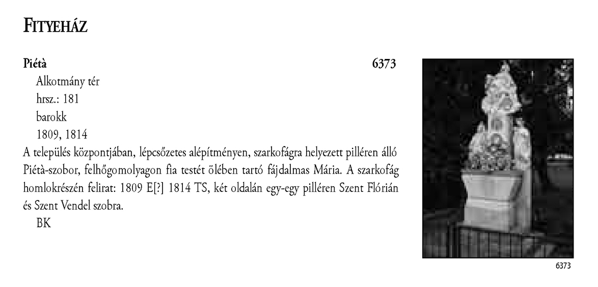 Nyilvános 2167 | 6395 | Fityeház - Magyarország műemlékjegyzéke - Zala megye 2006 027old | A részlet szövege: FITYEHÁZ Piétà 6373 Alkotmány tér hrsz.: 181 barokk 1809, 1814 A település központjában, lépcsőzetes alépítményen, szarkofágra helyezett pilléren álló Piétà-szobor, felhőgomolyagon fia testét ölében tartó fájdalmas Mária. A szarkofág homlokrészén felirat: 1809 E[?] 1814 TS, két oldalán egy-egy pilléren Szent Flórián és Szent Vendel szobra. BK A részlet a következő könyv online változatából származik: Cím: Magyarország műemlékjegyzéke Közreműködő: Haris Andrea. (szerk.) ; Kulturális Örökségvédelmi Hivatal (Budapest) (közread.) ; Somorjay Sélysette. (szerk.) ; Bardoly István (közrem.) Szerz. közl.: [sorozatszerk. Haris Andrea, Somorjay Sélysette] ; [mtárs Bardoly István] ; [közread. a] Kulturális Örökségvédelmi Hivatal. Kiadás: Budapest : KÖH, 2006 Kötetadat: Zala megye ISBN: 963-86510-7-5 ö ISBN: 963 7474 10 2 Nyelv: magyar A jegyzék a Kultúrális Örökségvédelmi Hivatal honlapján, a következő link alatt található: http://www.koh.hu/index.php?_mp=nyitolap&_amp=MUEML A fejléc adatairól 1. Objektum neve – törzsszám A fejléc első sora a műemlék eredeti rendeltetésének megfelelő nevet tartalmazza. Mögötte zárójelben templom esetében annak titulusa, más épületeknél indokolt esetben az eredeti rendeltetéstől eltérő, mai használatra utaló intézmény név (pl. városháza, múzeum, szálloda, oktatási intézmény hivatalos neve, stb.) olvasható. A törzsszám (trsz.) a műemlék egyetlen soha nem változó adata. A gyors azonosítás, illetve a törzsszám szerinti keresés lehetősége végett az objektummal egy sorban, a fejléc jobb szélén kiemelten jelenik meg. Összetartozó műemlék részek vagy történetileg egy együttest alkotó műemlékek sokszor külön törzsszámon lettek műemlékké nyilvánítva. Előfordulhat ezért, hogy egy fejléc alatt a leíró részben több, külön törzsszámmal rendelkező objektum szerepel. A törzsszámot ezekben az esetekben is az objektummal egy sorban tüntetjük fel. 2. Utca, házszám Egy utcán belül, amennyiben a számozás ezt lehetővé teszi, először a templomot adjuk meg, ezt követi a parókia, majd egyéb objektumok, pl. szobrok következnek. Házszám nélkül említünk egyes műemlékfajtákat (elsősorban templomokat), amennyiben a topográfiai azonosítás szempontjából a házszám közömbös vagy éppen zavaró. Előfordul, hogy a műemlék nem köthető nevesített közterülethez. Az ilyeneket a település végéhez soroltuk, és a leírásban kitértünk a településen belül elfoglalt helyükre. 3. Helyrajzi szám Ha egy helyrajzi számon és egy címen (pl. temetőben) több, külön törzsszámmal védett objektum van, akkor az együttesre utaló műemlék megnevezés alatt a közös adatokat egyszer adjuk meg. Ezt követően külön címszavanként következik a műemlékek leírása. Ilyen esetben az emlékeket mutatóztuk. Ezt az eljárást követtük, tekintet nélkül arra, hogy a teljes együttes védett-e vagy sem. (Védett együttes mellett mindig törzsszám szerepel.) Ha több helyrajzi szám is tartozik egy törzsszámhoz, akkor a fejlécben valamennyi számot feltüntettük. Amennyiben ilyen esetben több elemből álló műemlékről van szó, akkor a leíró részben minden külön említett elem után zárójelben megadjuk a vonatkozó helyrajzi számot. 4. Stílus A műemléket jelenleg meghatározó, domináns stílusjegy alapján került meghatározásra. Egyéb, érzékelhető stíluselemekre a leíró részben utalunk. 5. Datálás A műemléket jelenleg leginkább jellemző építési dátum. Korábbi építési periódusokra, illetve későbbi átépítésekre a történeti részben utalunk, fennmaradt részletek esetén lehetőség szerint azokra vonatkoztatva. A leírás A műemlékek leírása tartalmilag öt szakaszból áll, amely folyamatos szövegként jelenik meg. Az objektum topográfiai meghatározása a műemlék településen belüli vagy ahhoz viszonyított helyét adja meg, amennyiben ez az azonosításhoz nélkülözhetetlen, avagy azt segíti. Az emlék jellegének leírása utal a környezettel való kapcsolatra (tájolás, beépítés módja, környező terepviszonyok, amennyiben ezek jellemzőek), alaprajzi elrendezésre, tömegre és a jellegzetes homlokzati elemekre (pl. rizalitok, erkélyek, stb.). Részletes homlokzatleírás nem volt cél. Belső építészeti részletet csak akkor említünk meg, ha ez tartozékként jelentős, esetleg a datálás vagy a stílus meghatározás alapjául szolgált. Ezt követi az épület tartozékainak és berendezésének utalásszerű ismertetése (falfestés, üvegablak, berendezés), az adott elem után zárójelben az ismert mesterek nevével; az orgonát külön említjük, amennyiben hangszerként is műemléki értékkel bír. A mesternevekre, berendezésre történő utalás jelzésszerű, tételes információért a KÖH műemléki nyilvántartásához kell fordulni. A leírást az építéstörténet lényegesnek ítélt momentumainak felsorolása követi, a fejléc tartalmának megismétlése nélkül. Csak olyan adatokat szerepeltetünk, amelyek az építéstörténet szempontjából meghatározóak. A leírásban az építész és az építtető nevére, illetve a kivitelezőre külön utalás történik zárójelben. Az épület egyes részleteire vonatkozó építési dátumokat lehetőség szerint a leíró részben, az egyes épületrészek leírása után közöljük. Zala megye műemlékeinek revíziójára 2002–2003-ban került sor, a kéziratot 2006. augusztus 14-én zártuk le. A műemlékjegy-zék a KÖH hivatalos kiadványa, mely a Műemlékvédelmi Tudományos Intézet gondozásában jelenik meg. RÖVIDÍTÉSEK D – dél É – észak ev. – evangélikus gör. kat. – gör
