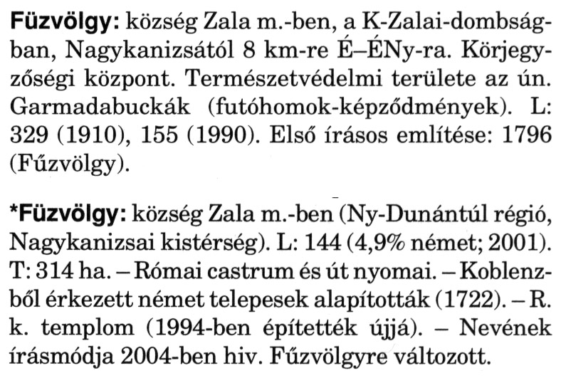 Nyilvános 2246 | 6137 | A szócikkek felismertetett szövege: | (A csillag után a kiegészítő kötetből származó szöveg következik) Füzvölgy: község Zala m.-ben, a K-Zalai-dombság-ban, Nagykanizsától 8 km-re É-ÉNy-ra. Körjegyzőségi központ. Természetvédelmi területe az ún. Garmadabuckák (futóhomok-képződmények). L: 329 (1910), 155 (1990). Első írásos említése: 1796 (Fűzvölgy). *Füzvölgy: község Zala m.-ben (Ny-Dunántúl régió, Nagykanizsai kistérség). L: 144 (4,9% német; 2001). T: 314 ha. - Római castrum és út nyomai. - Koblenz-ből érkezett német telepesek alapították (1722). - R. k. templom (1994-ben építették újjá). - Nevének írásmódja 2004-ben hiv. Fűzvölgyre változott. A szócikkek a következő lexikonból származnak: Cím: Magyar nagylexikon Közreműködő: Élesztős László (1949) (szerk.) ; Barabás Éva (1943) (szerk.) ; Berényi Gábor (1946) (szerk.) ; Bárány Lászlóné (szerk.) ; Adelmann-né Kertész Judit (1945) (közrem.) ; Froemel Károlyné Jáky Éva (1936) (közrem.) ; Akadémiai Kiadó és Nyomda Vállala Szerz. közl.: [... Élesztős László főszerk.] ; [szerk. Barabás Éva et al.] ; [bibliogr. Adelmanné Kertész Judit] ; [kész. az Akadémiai Kiadó Magyar Nagylexikon Szerkesztőségében] Kiadás: Budapest : Akad. K., 1993- Kötetei: 1. köt., A - Anc 2. köt., And - Bag 3. köt., Bah - Bij 4. köt., Bik - Bz 5. köt., C - Csem 6. köt., Csen - Ec 7. köt., Ed - Fe 8. köt., Ff - Gyep 9. köt., Gyer - Iq 10. köt., Ir - Kip 11. köt., Kir - Lem 12. köt., Len - Mep 13. köt., Mer - Nyk 14. köt., Nyl - Pom 15. köt., Pon - Sek 16. köt., Sel - Szö 17. köt., Szp - Ung 18. köt., Unh - Z 19. köt., Kiegészítő kötet, A - Z ETO jelzet: 030=945.11 Szakjelzet: 030 Cutter: M 14 ISBN: 963-05-6611-7 [!ISBN 963-05-6615-X] Nyelv: magyar Megjegyzés: Az 5. kötettől kiad. a Magyar Nagylexikon Kiadó ; A 6. kötettől főszerk. Berényi Gábor ; A 6. kötettől szakszerk. Bárány Lászlóné et al. ; A 6. kötettől bibliogr. Froemel Károlyné ; Bibliogr. a szócikkek végén |