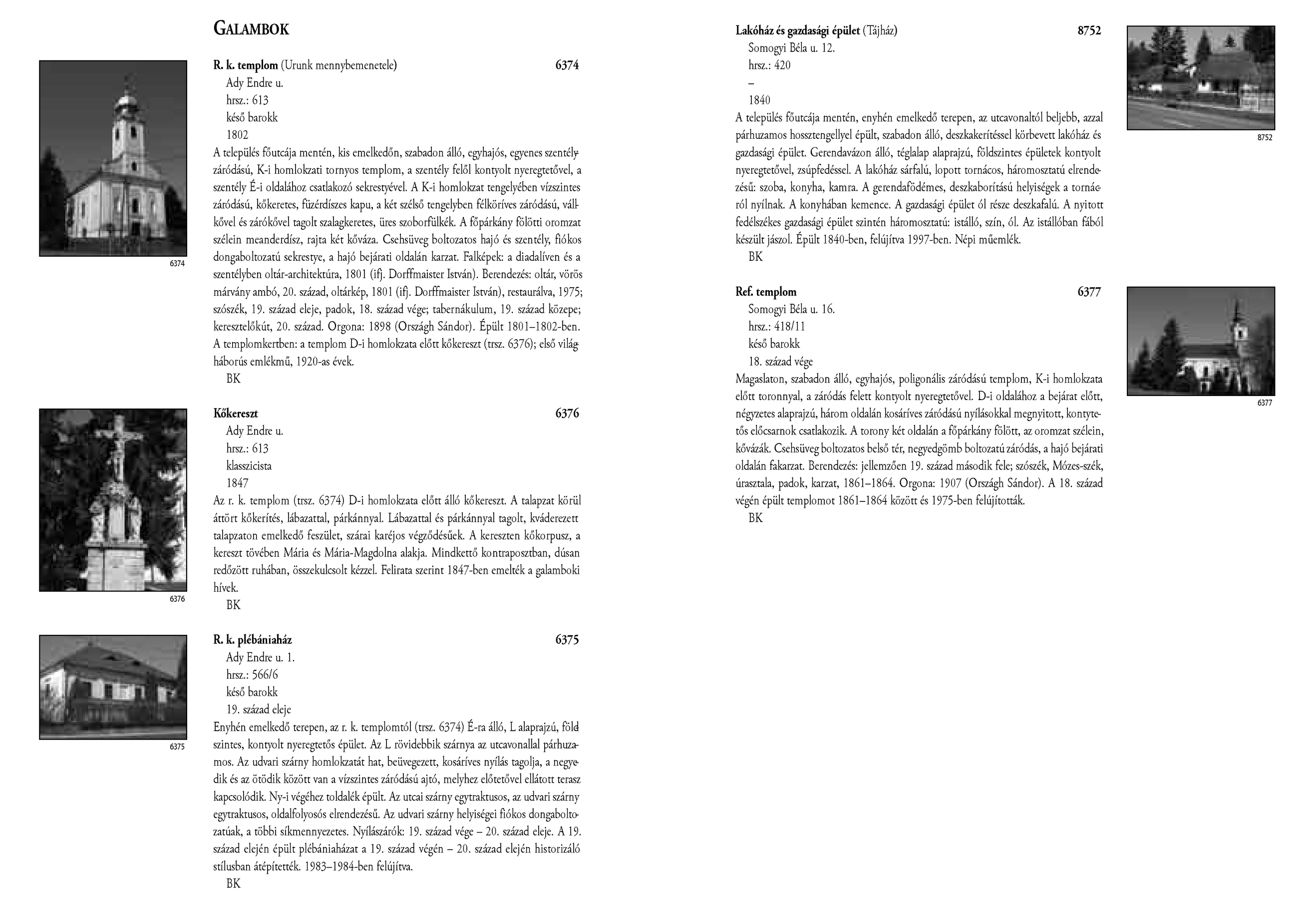 Nyilvános 2089 | 4403 | Rövid leírás | Teljes leírás (10.9 KB) | Galambok - Magyarország műemlékjegyzéke - Zala megye 2006 028-029old A részlet szövege: GALAMBOK 6374 R. k. templom (Urunk mennybemenetele) Ady Endre u. hrsz.: 613 késő barokk 1802 A település főutcája mentén, kis emelkedőn, szabadon álló, egyhajós, egyenes szentélyzáródású, K-i homlokzati tornyos templom, a szentély felől kontyolt nyeregtetővel, a szentély É-i oldalához csatlakozó sekrestyével. A K-i homlokzat tengelyében vízszintes záródású, kőkeretes, füzérdíszes kapu, a két szélső tengelyben félköríves záródású, vállkővel és zárókővel tagolt szalagkeretes, üres szoborfülkék. A főpárkány fölötti oromzat szélein meanderdísz, rajta két kőváza. Csehsüveg boltozatos hajó és szentély, fiókos dongaboltozatú sekrestye, a hajó bejárati oldalán karzat. Falképek: a diadalíven és a szentélyben oltár-architektúra, 1801 (ifj. Dorffmaister István). Berendezés: oltár, vörös márvány ambó, 20. század, oltárkép, 1801 (ifj. Dorffmaister István), restaurálva, 1975; szószék, 19. század eleje, padok, 18. század vége; tabernákulum, 19. század közepe; keresztelőkút, 20. század. Orgona: 1898 (Országh Sándor). Épült 1801–1802-ben. A templomkertben: a templom D-i homlokzata előtt kőkereszt (trsz. 6376); első világháborús emlékmű, 1920-as évek. BK Kőkereszt 6376 Ady Endre u. hrsz.: 613 klasszicista 1847 Az r. k. templom (trsz. 6374) D-i homlokzata előtt álló kőkereszt. A talapzat körül áttört kőkerítés, lábazattal, párkánnyal. Lábazattal és párkánnyal tagolt, kváderezett talapzaton emelkedő feszület, szárai karéjos végződésűek. A kereszten kőkorpusz, a kereszt tövében Mária és Mária-Magdolna alakja. Mindkettő kontraposztban, dúsan redőzött ruhában, összekulcsolt kézzel. Felirata szerint 1847-ben emelték a galamboki hívek. BK 6375 R. k. plébániaház 6375 Ady Endre u. 1. hrsz.: 566/6 késő barokk 19. század eleje Enyhén emelkedő terepen, az r. k. templomtól (trsz. 6374) É-ra álló, L alaprajzú, földszintes, kontyolt nyeregtetős épület. Az L rövidebbik szárnya az utcavonallal párhuzamos. Az udvari szárny homlokzatát hat, beüvegezett, kosáríves nyílás tagolja, a negyedik és az ötödik között van a vízszintes záródású ajtó, melyhez előtetővel ellátott terasz kapcsolódik. Ny-i végéhez toldalék épült. Az utcai szárny egytraktusos, az udvari szárny egytraktusos, oldalfolyosós elrendezésű. Az udvari szárny helyiségei fiókos dongaboltozatúak, a többi síkmennyezetes. Nyílászárók: 19. század vége – 20. század eleje. A 19. század elején épült plébániaházat a 19. század végén – 20. század elején historizáló stílusban átépítették. 1983–1984-ben felújítva. BK Lakóház és gazdasági épület Somogyi Béla u. 12. hrsz.: 420 – (Tájház) 8752 A település főutcája mentén, enyhén emelkedő terepen, az utcavonaltól beljebb, azzal párhuzamos hossztengellyel épült, szabadon álló, deszkakerítéssel körbevett lakóház és gazdasági épület. Gerendavázon álló, téglalap alaprajzú, földszintes épületek kontyolt nyeregtetővel, zsúpfedéssel. A lakóház sárfalú, lopott tornácos, háromosztatú elrendezésű: szoba, konyha, kamra. A gerendafödémes, deszkaborítású helyiségek a tornácról nyílnak. A konyhában kemence. A gazdasági épület ól része deszkafalú. A nyitott fedélszékes gazdasági épület szintén háromosztatú: istálló, szín, ól. Az istállóban fából készült jászol. Épült 1840-ben, felújítva 1997-ben. Népi műemlék. BK Ref. templom 6377 Somogyi Béla u. 16. hrsz.: 418/11 késő barokk 18. század vége Magaslaton, szabadon álló, egyhajós, poligonális záródású templom, K-i homlokzata előtt toronnyal, a záródás felett kontyolt nyeregtetővel. D-i oldalához a bejárat előtt, négyzetes alaprajzú, három oldalán kosáríves záródású nyílásokkal megnyitott, kontytetős előcsarnok csatlakozik. A torony két oldalán a főpárkány fölött, az oromzat szélein, kővázák. Csehsüveg boltozatos belső tér, negyedgömb boltozatú záródás, a hajó bejárati oldalán fakarzat. Berendezés: jellemzően 19. század második fele; szószék, Mózes-szék, úrasztala, padok, karzat, 1861–1864. Orgona: 1907 (Országh Sándor). A 18. század végén épült templomot 1861–1864 között és 1975-ben felújították. BK A részlet a következő könyv online változatából származik: Cím: Magyarország műemlékjegyzéke Közreműködő: Haris Andrea. (szerk.) ; Kulturális Örökségvédelmi Hivatal (Budapest) (közread.) ; Somorjay Sélysette. (szerk.) ; Bardoly István (közrem.) Szerz. közl.: [sorozatszerk. Haris Andrea, Somorjay Sélysette] ; [mtárs Bardoly István] ; [közread. a] Kulturális Örökségvédelmi Hivatal. Kiadás: Budapest : KÖH, 2006 Kötetadat: Zala megye ISBN: 963-86510-7-5 ö ISBN: 963 7474 10 2 Nyelv: magyar A jegyzék a Kultúrális Örökségvédelmi Hivatal honlapján, a következő link alatt található: http://www.koh.hu/index.php?_mp=nyitolap&_amp=MUEML A fejléc adatairól 1. Objektum neve – törzsszám A fejléc első sora a műemlék eredeti rendeltetésének megfelelő nevet tartalmazza. Mögötte zárójelben templom esetében annak titulusa, más épületeknél indokolt esetben az eredeti rendeltetéstől eltérő, mai használatra utaló intézmény név (pl. városháza, múzeum, szálloda, oktatási intézmény hivatalos neve, stb.) olvasható. A törzsszám (trsz.) a műemlék egyetlen soha nem változó adata. A gyors azonosítás, illetve a törzsszám szerinti keresés lehetősége végett az objektummal egy sorban, a fejléc jobb szélén kiemelten jelenik meg. Összetartozó műemlék részek vagy történetileg egy együttest alkotó műemlékek sokszor külön törzsszámon let