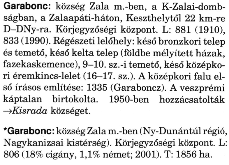 Nyilvános 2362 | 6307 | A szócikkek felismertetett szövege: | (A csillag után a kiegészítő kötetből származó szöveg következik) Garabonc: község Zala m.-ben, a K-Zalai-domb-ságban, a Zalaapáti-háton, Keszthelytől 22 km-re D-DNy-ra. Körjegyzőségi központ. L: 881 (1910), 833 (1990). Régészeti lelőhely: késő bronzkori telep és temető, késő kelta telep (földbe mélyített házak, fazekaskemence), 9-10. sz.-i temető, késő középkori éremkincs-lelet (16-17. sz.). A középkori falu első írásos említése: 1335 (Garaboncz). A veszprémi káptalan birtokolta. 1950-ben hozzácsatolták →Kisrada községet. *Garabonc: község Zala m.-ben (Ny-Dunántúl régió, Nagykanizsai kistérség). Körjegyzőségi központ. L: 806 (18% cigány, 1,1% német; 2001). T: 1856 ha. A szócikkek a következő lexikonból származnak: Cím: Magyar nagylexikon Közreműködő: Élesztős László (1949) (szerk.) ; Barabás Éva (1943) (szerk.) ; Berényi Gábor (1946) (szerk.) ; Bárány Lászlóné (szerk.) ; Adelmann-né Kertész Judit (1945) (közrem.) ; Froemel Károlyné Jáky Éva (1936) (közrem.) ; Akadémiai Kiadó és Nyomda Vállala Szerz. közl.: [... Élesztős László főszerk.] ; [szerk. Barabás Éva et al.] ; [bibliogr. Adelmanné Kertész Judit] ; [kész. az Akadémiai Kiadó Magyar Nagylexikon Szerkesztőségében] Kiadás: Budapest : Akad. K., 1993- Kötetei: 1. köt., A - Anc 2. köt., And - Bag 3. köt., Bah - Bij 4. köt., Bik - Bz 5. köt., C - Csem 6. köt., Csen - Ec 7. köt., Ed - Fe 8. köt., Ff - Gyep 9. köt., Gyer - Iq 10. köt., Ir - Kip 11. köt., Kir - Lem 12. köt., Len - Mep 13. köt., Mer - Nyk 14. köt., Nyl - Pom 15. köt., Pon - Sek 16. köt., Sel - Szö 17. köt., Szp - Ung 18. köt., Unh - Z 19. köt., Kiegészítő kötet, A - Z ETO jelzet: 030=945.11 Szakjelzet: 030 Cutter: M 14 ISBN: 963-05-6611-7 [!ISBN 963-05-6615-X] Nyelv: magyar Megjegyzés: Az 5. kötettől kiad. a Magyar Nagylexikon Kiadó ; A 6. kötettől főszerk. Berényi Gábor ; A 6. kötettől szakszerk. Bárány Lászlóné et al. ; A 6. kötettől bibliogr. Froemel Károlyné ; Bibliogr. a szócikkek végén |