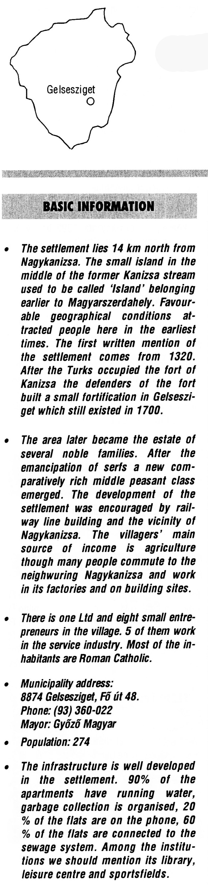 Nyilvános 2200 | 6381 | Gelsesziget | BASIC INFORMATION • The settlement lies 14 km north from Nagykanizsa. The small island in the middle of the former Kanizsa stream used to be called \'Island\' belonging earlier to Magyarszerdahely. Favourable geographical conditions attracted people here in the earliest times. The first written mention of the settlement comes from 1320. After the Turks occupied the fort of Kanizsa the defenders of the fort built a small fortification in Gelsesziget which still existed in 1700. • The area later became the estate of several noble families. After the emancipation of serfs a new comparatively rich middle peasant class emerged. The development of the settlement was encouraged by railway line building and the vicinity of Nagykanizsa. The villagers\' main source of income is agriculture though many people commute to the neighwuring Nagykanizsa and work in its factories and on building sites. • There is one Ltd and eight small entrepreneurs in the village. 5 of them work in the service industry. Most of the inhabitants are Roman Catholic. • Municipality address: 8874 Gelsesziget, Fő út 48. Phone: (93) 360-022 Mayor: Győző Magyar • Population: 274 • The infrastructure is well developed in the settlement. 90% of the apartments have running water, garbage collection is organised, 20 % of the flats are on the phone, 60 % of the flats are connected to the sewage system. Among the institutions we should mention its library, leisure centre and sportsfields. This text came from the following book: Title: Handbook of Zala county (Zala megye kézikönyve) Series: County handbooks of Hungary (Magyarország megyei kézikönyvei) Chief editor: Hóbor József Publisher: (Hatvan), CEBA-Hungary Ltd, 1998 ETO: 908.439.121(035) ; 050.8(439.121) ISBN: 963-9089-18-2 Pages: 488-1040 p. Remark: Closed on: 1998. márc. 31. |