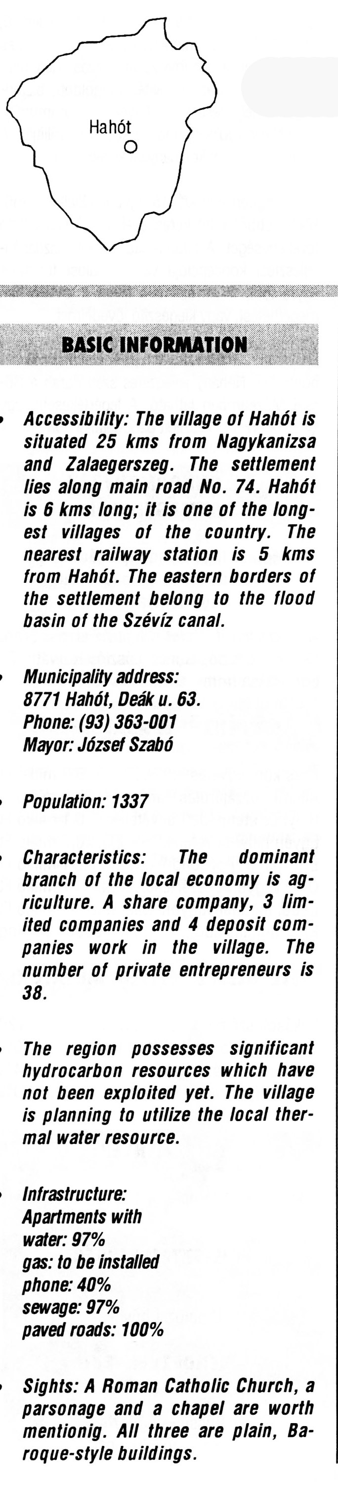 Nyilvános 2449 | 6662 | Hahót | BASIC INFORMATION Accessibility: The village of Hahót is situated 25 kms from Nagykanizsa and Zalaegerszeg. The settlement lies along main road No. 74. Hahót is 6 kms long; it is one of the longest villages of the country. The nearest railway station is 5 kms from Hahót. The eastern borders of the settlement belong to the flood basin of the Szévíz canal. Municipality address: 8771 Hahót, Deák u. 63. Phone: (93) 363-001 Mayor: József Szabó Population: 1337 Characteristics: The dominant branch of the local economy is agriculture. A share company, 3 limited companies and 4 deposit companies work in the village. The number of private entrepreneurs is 38. The region possesses significant hydrocarbon resources which have not been exploited yet. The village is planning to utilize the local thermal water resource. Infrastructure: Apartments with water: 97% gas: to be installed phone: 40% sewage: 97% paved roads: 100% Sights: A Roman Catholic Church, a parsonage and a chapel are worth mentionig. All three are plain, Baroque-style buildings. This text came from the following book: Title: Handbook of Zala county (Zala megye kézikönyve) Series: County handbooks of Hungary (Magyarország megyei kézikönyvei) Chief editor: Hóbor József Publisher: (Hatvan), CEBA-Hungary Ltd, 1998 ETO: 908.439.121(035) ; 050.8(439.121) ISBN: 963-9089-18-2 Pages: 488-1040 p. Remark: Closed on: 1998. márc. 31. |