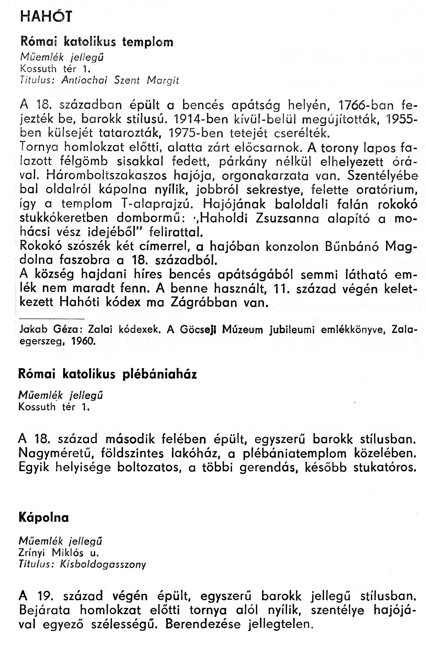 Nyilvános 2309 | 6108 | Hahót - Zala megye műemlékei 1977 059-060old | A részlet szövege: HAHÓT Római katolikus templom Műemlék jellegű Kossuth tér 1. Titulus: Antiochai Szent Margit A 18. században épült a bencés apátság helyén, 1766-ban fejezték be, barokk stílusú. 1914-ben kívül-belül megújították, 1955-ben külsejét tatarozták, 1975-ben tetejét cserélték. Tornya homlokzat előtti, alatta zárt előcsarnok. A torony lapos falazott félgömb sisakkal fedett, párkány nélkül elhelyezett órával. Háromboltszakaszos hajója, orgonakarzata van. Szentélyébe bal oldalról kápolna nyílik, jobbról sekrestye, felette oratórium, így a templom T-alaprajzú. Hajójának baloldali falán rokokó stukkókeretben dombormű: "Haholdi Zsuzsanna alapító a mohácsi vész idejéből" felirattal. Rokokó szószék két címerrel, a hajóban konzolon Bűnbánó Magdolna faszobra a 18. századból. A község hajdani híres bencés apátságából semmi látható emlék nem maradt fenn. A benne használt, 11. század végén keletkezett Hahóti kódex ma Zágrábban van. Jakab Géza: Zalai kódexek. A Göcseji Múzeum jubileumi emlékkönyve, Zalaegerszeg, 1960. Római katolikus plébániaház Műemlék jellegű Kossuth tér 1. A 18. század második felében épült, egyszerű barokk stílusban. Nagyméretű, földszintes lakóház, a plébániatemplom közelében. Egyik helyisége boltozatos, a többi gerendás, később stukatóros. Kápolna Műemlék jellegű Zrínyi Miklós u. Titulus: Kisboldogasszony A 19. század végén épült, egyszerű barokk jellegű stílusban. Bejárata homlokzat előtti tornya alól nyílik, szentélye hajójával egyező szélességű. Berendezése jellegtelen. A részlet a következő könyvből származik: Cím: Zala megye műemlékei Szerző: Németh József (1928) Közreműködő: Lantos Miklós (fotó) Szerz. közl.: Németh József ; [fotók... Lantos Miklós] Kiadás: Zalaegerszeg : Zalai Ny., 1977 ETO jelzet: 72(439.121) ; 7.025.3/.4 ; 908.439.121 Tárgyszó: Zala megye Szakjelzet: 908 Cutter: N 53 Nyelv: magyar Oldalszám: 109 p. |