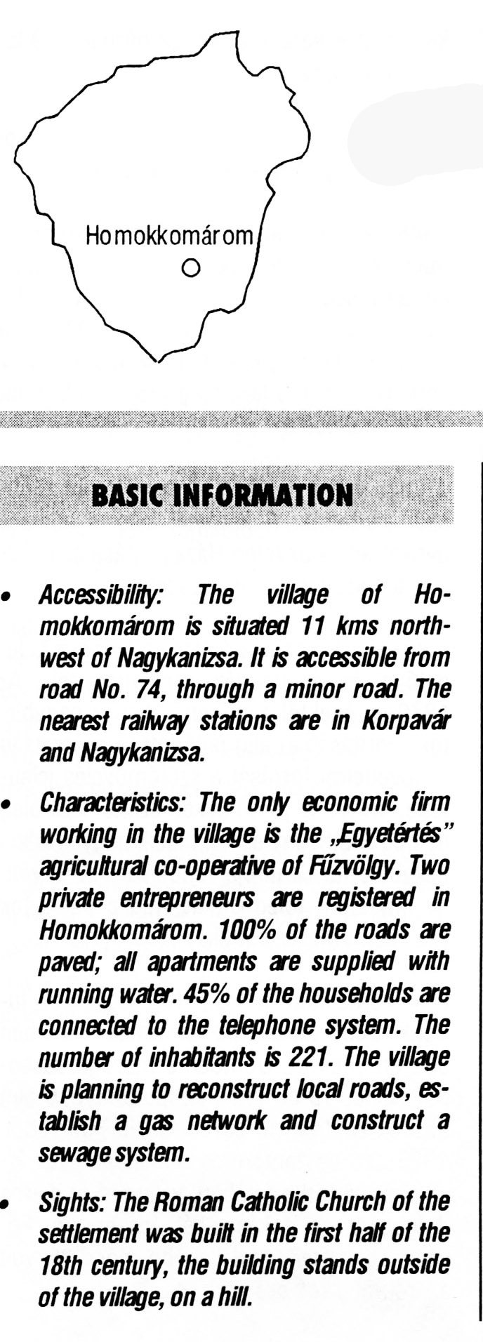 Nyilvános 2263 | 6328 | Rövid leírás | Teljes leírás (1.32 KB) | Homokkomárom BASIC INFORMATION Accessibility: The village of Homokkomárom is situated 11 kms northwest of Nagykanizsa. It is accessible from road No. 74, through a minor road. The nearest railway stations are in Korpavár and Nagykanizsa. Characteristics: The only economic firm working in the village is the „Egyetértés” agricultural co-operative of Fűzvölgy. Two private entrepreneurs are registered in Homokkomárom. 100% of the roads are paved; all apartments are supplied with running water. 45% of the households are connected to the telephone system. The number of inhabitants is 221. The village is planning to reconstruct local roads, establish a gas network and construct a sewage system. Sights: The Roman Catholic Church of the settlement was built in the first half of the 18th century, the building stands outside of the village, on a hill. This text came from the following book: Title: Handbook of Zala county (Zala megye kézikönyve) Series: County handbooks of Hungary (Magyarország megyei kézikönyvei) Chief editor: Hóbor József Publisher: (Hatvan), CEBA-Hungary Ltd, 1998 ETO: 908.439.121(035) ; 050.8(439.121) ISBN: 963-9089-18-2 Pages: 488-1040 p. Remark: Closed on: 1998. márc. 31. |
