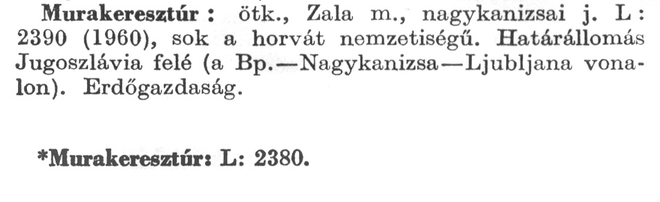 Nyilvános 2003 | 5425 | A szócikkek felismertetett szövege: | (A csillag után az 1972-es kiadású kiegészítő kötetből származó szöveg következik) Murakeresztúr: ötk., Zala m., nagykanizsai j. L: 2390 (1960), sok a horvát nemzetiségű. Határállomás Jugoszlávia felé (a Bp.–Nagykanizsa–Ljubljana vonalon). Erdőgazdaság. *Murakeresztúr: L: 2380. A szócikkek a következő lexikonból származnak: Cím: Új magyar lexikon Közreműködő: Berei Andor (1900-1979) (szerk.) Szerz. közl.: [szerk. Berei Andor et al.] Kiadás jelzés: 2. lny. Kiadás: Budapest : Akad. K., 1961-1962 Kötetei: 1., A - C 2., D - F 3., G - J 4., K - Me 5., Mf - R 6., S - Z 7. köt., A-Z Kiegészítő kötet (1972) Kiegészítő kötet, 1962÷1980 (1981) ETO jelzet: 03=945.11 Szakjelzet: 030 Cutter: U 28 Nyelv: magyar Megjegyzés: Bibliogr. a címszavak egy részének végén |