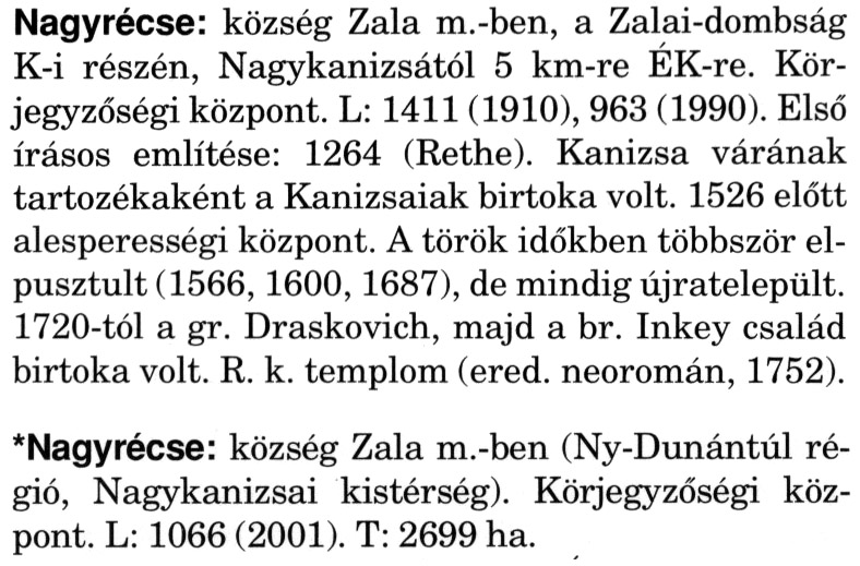 Nyilvános 2367 | 6222 | A szócikkek felismertetett szövege: | (A csillag után a kiegészítő kötetből származó szöveg következik) Nagyrécse: község Zala m.-ben, a Zalai-dombság K-i részén, Nagykanizsától 5 km-re ÉK-re. Körjegyzőségi központ. L: 1411 (1910), 963 (1990). Első írásos említése: 1264 (Rethe). Kanizsa várának tartozékaként a Kanizsaiak birtoka volt. 1526 előtt alesperességi központ. A török időkben többször elpusztult (1566, 1600, 1687), de mindig újratelepült. 1720-tól a gr. Draskovich, majd a br. Inkey család birtoka volt. R. k. templom (ered. neoromán, 1752). *Nagyrécse: község Zala m.-ben (Ny-Dunántúl régió, Nagykanizsai kistérség). Körjegyzőségi központ. L: 1066 (2001). T: 2699 ha. A szócikkek a következő lexikonból származnak: Cím: Magyar nagylexikon Közreműködő: Élesztős László (1949) (szerk.) ; Barabás Éva (1943) (szerk.) ; Berényi Gábor (1946) (szerk.) ; Bárány Lászlóné (szerk.) ; Adelmann-né Kertész Judit (1945) (közrem.) ; Froemel Károlyné Jáky Éva (1936) (közrem.) ; Akadémiai Kiadó és Nyomda Vállala Szerz. közl.: [... Élesztős László főszerk.] ; [szerk. Barabás Éva et al.] ; [bibliogr. Adelmanné Kertész Judit] ; [kész. az Akadémiai Kiadó Magyar Nagylexikon Szerkesztőségében] Kiadás: Budapest : Akad. K., 1993- Kötetei: 1. köt., A - Anc 2. köt., And - Bag 3. köt., Bah - Bij 4. köt., Bik - Bz 5. köt., C - Csem 6. köt., Csen - Ec 7. köt., Ed - Fe 8. köt., Ff - Gyep 9. köt., Gyer - Iq 10. köt., Ir - Kip 11. köt., Kir - Lem 12. köt., Len - Mep 13. köt., Mer - Nyk 14. köt., Nyl - Pom 15. köt., Pon - Sek 16. köt., Sel - Szö 17. köt., Szp - Ung 18. köt., Unh - Z 19. köt., Kiegészítő kötet, A - Z ETO jelzet: 030=945.11 Szakjelzet: 030 Cutter: M 14 ISBN: 963-05-6611-7 [!ISBN 963-05-6615-X] Nyelv: magyar Megjegyzés: Az 5. kötettől kiad. a Magyar Nagylexikon Kiadó ; A 6. kötettől főszerk. Berényi Gábor ; A 6. kötettől szakszerk. Bárány Lászlóné et al. ; A 6. kötettől bibliogr. Froemel Károlyné ; Bibliogr. a szócikkek végén |