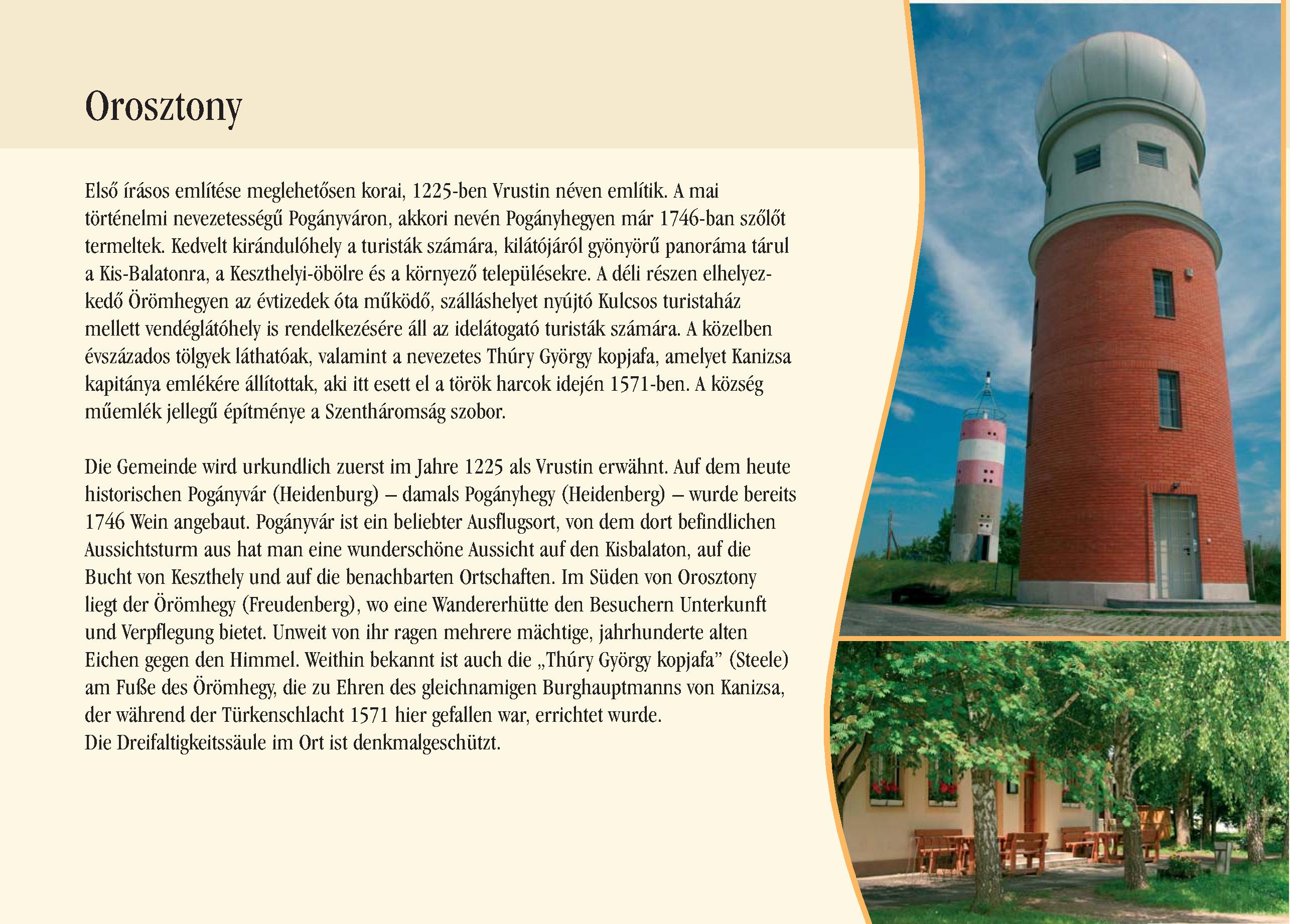 Nyilvános 2560 | 8617 | Orosztony | Die Gemeinde wird urkundlich zuerst im Jahre 1225 als Vrustin erwähnt. Auf dem heute historischen Pogányvár (Heidenburg) damals Pogányhegy (Heidenberg) wurde bereits 1746 Wein angebaut. Pogányvár ist ein beliebter Ausflugsort, von dem dort befindlichen Aussichtsturm aus hat man eine wunderschöne Aussicht auf den Kisbalaton, auf die Bucht von Keszthely und auf die benachbarten Ortschaften. Im Süden von Orosztony liegt der Örömhegy (Freudenberg), wo eine Wandererhütte den Besuchern Unterkunft und Verpflegung bietet. Unweit von ihr ragen mehrere mächtige, jahrhunderte alten Eichen gegen den Himmel. Weithin bekannt ist auch die ,,Thúry György kopjafa" (Steele) am Fuße des Örömhegy, die zu Ehren des gleichnamigen Burghauptmanns von Kanizsa, der während der Türkenschlacht 1571 hier gefallen war, errichtet wurde. Die Dreifaltigkeitssäule im Ort ist denkmalgeschützt. Dieses Text stammt von: Pannonhát tájpark prospektus 2006. Web: http://www.pannonhat.hu/ (auch in Deutsch) |