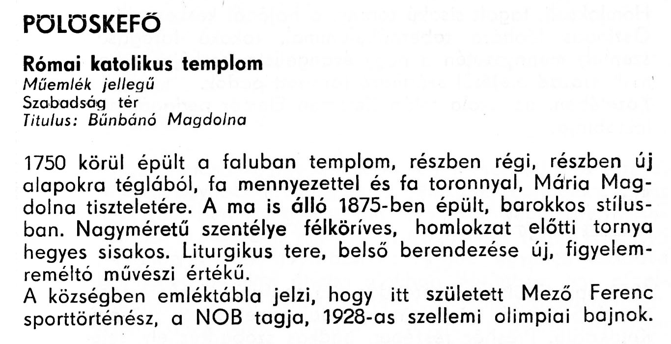 Nyilvános 2239 | 5526 | Pölöskefő - Zala megye műemlékei 1977 081old | A részlet szövege: PÖLÖSKEFÖ Római katolikus templom Műemlék jellegű Szabadság tér Titulus: Bűnbánó Magdolna 1750 körül épült a faluban templom, részben régi, részben új alapokra téglából, fa mennyezettel és fa toronnyal, Mária Magdolna tiszteletére. A ma is álló 1875-ben épült, barokkos stílusban. Nagyméretű szentélye félköríves, homlokzat előtti tornya hegyes sisakos. Liturgikus tere, belső berendezése új, figyelemreméltó művészi értékű. A községben emléktábla jelzi, hogy itt született Mező Ferenc sporttörténész, a NOB tagja, 1928-as szellemi olimpiai bajnok. A részlet a következő könyvből származik: Cím: Zala megye műemlékei Szerző: Németh József (1928) Közreműködő: Lantos Miklós (fotó) Szerz. közl.: Németh József ; [fotók... Lantos Miklós] Kiadás: Zalaegerszeg : Zalai Ny., 1977 ETO jelzet: 72(439.121) ; 7.025.3/.4 ; 908.439.121 Tárgyszó: Zala megye Szakjelzet: 908 Cutter: N 53 Nyelv: magyar Oldalszám: 109 p. |