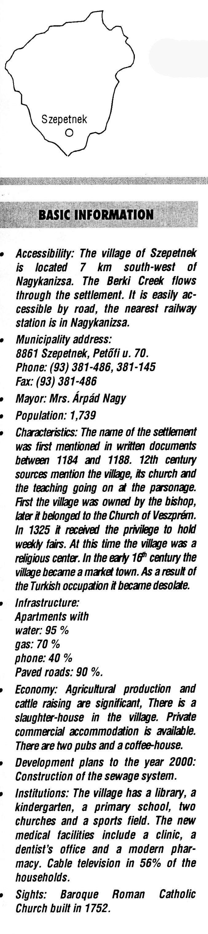 Nyilvános 2083 | 5640 | Szepetnek | BASIC INFORMATION Accessibility: The village of Szepetnek is located 7 km south-west of Nagykanizsa. The Berki Creek flows through the settlement. It is easily accessible by road, the nearest railway station is in Nagykanizsa. Municipality address: 8861 Szepetnek, Petőfi u. 70. Phone: (93) 381-486, 381-145 Fax: (93) 381-486 Mayor: Mrs. Árpád Nagy Population: 1,739 Characteristics: The name of the settlement was first mentioned in written documents between 1184 and 1188. 12th century sources mention the village, its church and the teaching going on at the parsonage. First the village was owned by the bishop, later it belonged to the Church of Veszprém. In 1325 it received the privilege to hold weekly fairs. At this time the village was a religious center. In the early 16th century the village became a market town. As a result of the Turkish occupation it became desolate. Infrastructure: Apartments with water: 95 % gas: 70 % phone: 40 % Paved roads: 90 %. Economy: Agricultural production and cattle raising are significant, There is a slaughter-house in the village. Private commercial accommodation is available. There are two pubs and a coffee-house. Development plans to the year 2000: Construction of the sewage system. Institutions: The village has a library, a kindergarten, a primary school, two churches and a sports field. The new medical facilities include a clinic, a dentist\'s office and a modern pharmacy. Cable television in 56% of the households. Sights: Baroque Roman Catholic Church built in 1752. This text came from the following book: Title: Handbook of Zala county (Zala megye kézikönyve) Series: County handbooks of Hungary (Magyarország megyei kézikönyvei) Chief editor: Hóbor József Publisher: (Hatvan), CEBA-Hungary Ltd, 1998 ETO: 908.439.121(035) ; 050.8(439.121) ISBN: 963-9089-18-2 Pages: 488-1040 p. Remark: Closed on: 1998. márc. 31. |