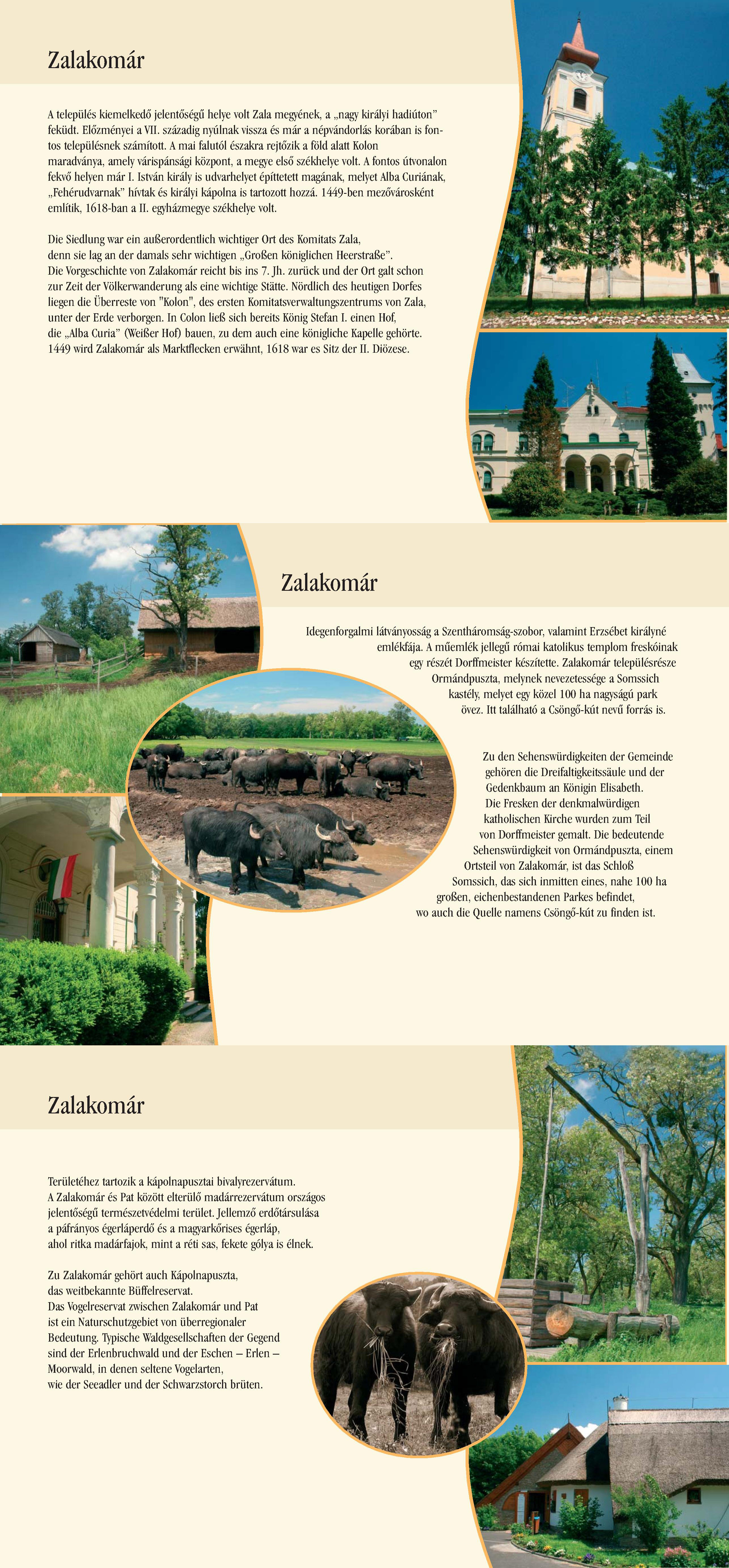 Nyilvános 1957 | 5656 | Rövid leírás | Teljes leírás (1.7 KB) | Zalakomár Die Siedlung war ein außerordentlich wichtiger Ort des Komitats Zala, denn sie lag an der damals sehr wichtigen ,,Großen königlichen Heerstraße". Die Vorgeschichte von Zalakomár reicht bis ins 7. Jh. zurück und der Ort galt schon zur Zeit der Völkerwanderung als eine wichtige Stätte. Nördlich des heutigen Dorfes liegen die Überreste von "Kolon", des ersten Komitatsverwaltungszentrums von Zala, unter der Erde verborgen. In Colon ließ sich bereits König Stefan I. einen Hof, die ,,Alba Curia" (Weißer Hof) bauen, zu dem auch eine königliche Kapelle gehörte. 1449 wird Zalakomár als Marktflecken erwähnt, 1618 war es Sitz der II. Diözese. Zu den Sehenswürdigkeiten der Gemeinde gehören die Dreifaltigkeitssäule und der Gedenkbaum an Königin Elisabeth. Die Fresken der denkmalwürdigen katholischen Kirche wurden zum Teil von Dorffmeister gemalt. Die bedeutende Sehenswürdigkeit von Ormándpuszta, einem Ortsteil von Zalakomár, ist das Schloß Somssich, das sich inmitten eines, nahe 100 ha großen, eichenbestandenen Parkes befindet, wo auch die Quelle namens Csöngő-kút zu finden ist. Zu Zalakomár gehört auch Kápolnapuszta, das weitbekannte Büffelreservat. Das Vogelreservat zwischen Zalakomár und Pat ist ein Naturschutzgebiet von überregionaler Bedeutung. Typische Waldgesellschaften der Gegend sind der Erlenbruchwald und der Eschen - Erlen - Moorwald, in denen seltene Vogelarten, wie der Seeadler und der Schwarzstorch brüten. Dieses Text stammt von: Pannonhát tájpark prospektus 2006. Web: http://www.pannonhat.hu/ (auch in Deutsch) |