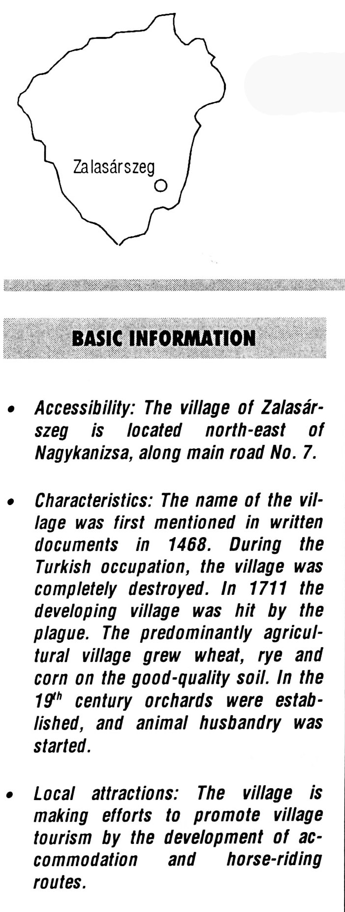 Nyilvános 2216 | 5751 | Zalasárszeg | BASIC INFORMATION Accessibility: The village of Zalasárszeg is located north-east of Nagykanizsa, along main road No. 7. Characteristics: The name of the village was first mentioned in written documents in 1468. During the Turkish occupation, the village was completely destroyed. In 1711 the developing village was hit by the plague. The predominantly agricultural village grew wheat, rye and corn on the good-quality soil. In the 19th century orchards were established, and animal husbandry was started. Local attractions: The village is making efforts to promote village tourism by the development of accommodation and horse-riding routes. This text came from the following book: Title: Handbook of Zala county (Zala megye kézikönyve) Series: County handbooks of Hungary (Magyarország megyei kézikönyvei) Chief editor: Hóbor József Publisher: (Hatvan), CEBA-Hungary Ltd, 1998 ETO: 908.439.121(035) ; 050.8(439.121) ISBN: 963-9089-18-2 Pages: 488-1040 p. Remark: Closed on: 1998. márc. 31. |