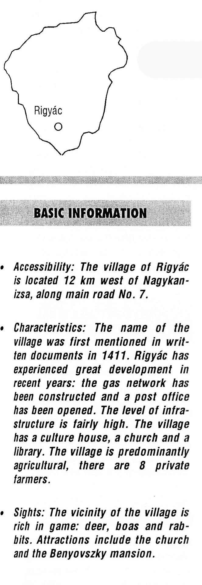 Nyilvános 2295 | 5922 | Rigyác | BASIC INFORMATION Accessibility. The village of Rigyác is located 12 km west of Nagykanizsa, along main road No. 7. Characteristics: The name of the village was first mentioned in written documents in 1411. Rigyác has experienced great development in recent years: the gas network has been constructed and a post office has been opened. The level of infrastructure is fairly high. The village has a culture house, a church and a library. The village is predominantly agricultural, there are 8 private farmers. Sights: The vicinity of the village is rich in game: deer, boas and rabbits. Attractions include the church and the Benyovszky mansion. This text came from the following book: Title: Handbook of Zala county (Zala megye kézikönyve) Series: County handbooks of Hungary (Magyarország megyei kézikönyvei) Chief editor: Hóbor József Publisher: (Hatvan), CEBA-Hungary Ltd, 1998 ETO: 908.439.121(035) ; 050.8(439.121) ISBN: 963-9089-18-2 Pages: 488-1040 p. Remark: Closed on: 1998. márc. 31. |