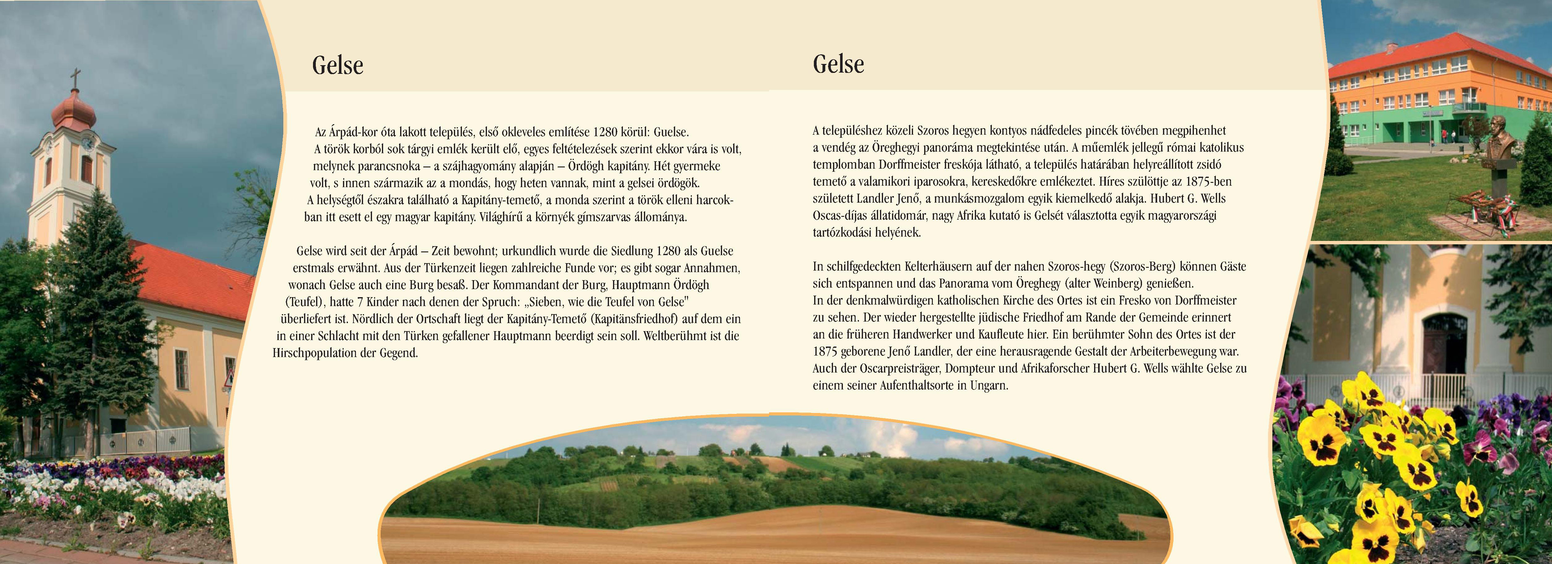 Nyilvános 2206 | 6607 | Rövid leírás | Teljes leírás (1.42 KB) | Gelse Gelse wird seit der Árpád ¬ Zeit bewohnt; urkundlich wurde die Siedlung 1280 als Guelse erstmals erwähnt. Aus der Türkenzeit liegen zahlreiche Funde vor; es gibt sogar Annahmen, wonach Gelse auch eine Burg besaß. Der Kommandant der Burg, Hauptmann Ördögh (Teufel), hatte 7 Kinder nach denen der Spruch: ,,Sieben, wie die Teufel von Gelse" überliefert ist. Nördlich der Ortschaft liegt der Kapitány-Temető (Kapitänsfriedhof) auf dem ein in einer Schlacht mit den Türken gefallener Hauptmann beerdigt sein soll. Weltberühmt ist die Hirschpopulation der Gegend. In schilfgedeckten Kelterhäusern auf der nahen Szoros-hegy (Szoros-Berg) können Gäste sich entspannen und das Panorama vom Öreghegy (alter Weinberg) genießen. In der denkmalwürdigen katholischen Kirche des Ortes ist ein Fresko von Dorffmeister zu sehen. Der wieder hergestellte jüdische Friedhof am Rande der Gemeinde erinnert an die früheren Handwerker und Kaufleute hier. Ein berühmter Sohn des Ortes ist der 1875 geborene Jenő Landler, der eine herausragende Gestalt der Arbeiterbewegung war. Auch der Oscarpreisträger, Dompteur und Afrikaforscher Hubert G. Wells wählte Gelse zu einem seiner Aufenthaltsorte in Ungarn. Dieses Text stammt von: Pannonhát tájpark prospektus 2006. Web: http://www.pannonhat.hu/ (auch in Deutsch) |