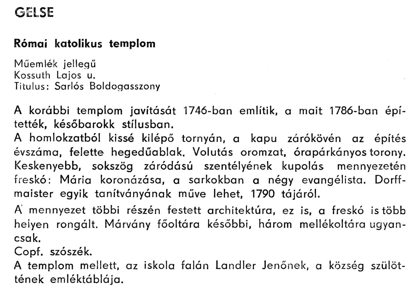Nyilvános 1881 | 4134 | Gelse - Zala megye műemlékei 1979 070old | A részlet szövege: GELSE Római katolikus templom Műemlék jellegű Kossuth Lajos u. Titulus: Sarlós Boldogasszony A korábbi templom javítását 1746-ban említik, a mait 1786-ban építették, későbarokk stílusban. A homlokzatból kissé kilépő tornyán, a kapu zárókövén az építés évszáma, felette hegedűablak. Volutás oromzat, órapárkányos torony. Keskenyebb, sokszög záródású szentélyének kupolás mennyezetén freskó: Mária koronázása, a sarkokban a négy evangélista. Dorffmaister egyik tanítványának műve lehet, 1790 tájáról. A mennyezet többi részén festett architektúra, ez is, a freskó is több helyen rongált. Márvány főoltára későbbi, három mellékoltára ugyancsak. Copf. szószék. A templom mellett, az iskola falán Landler Jenőnek, a község szülöttének emléktáblája. A részlet a következő könyvből származik: Cím: Zala megye műemlékei Szerző: Németh József (1928) Közreműködő: Vándor László (szerk.) ; Szabóky Zsolt (1941) (fotó) Szerz. közl.: Németh József ; [szerk. Vándor László] ; [fotók... Szabóky Zsolt] Kiadás jelzés: 2. bőv. kiad. Kiadás: Zalaegerszeg : Zalai Ny., 1979 ETO jelzet: 72(439.121) ; 7.025.3/.4(439.121) ; 908.439.121 Tárgyszó: Zala Szakjelzet: 908 Cutter: N 53 Nyelv: magyar Oldalszám: 134 p. |