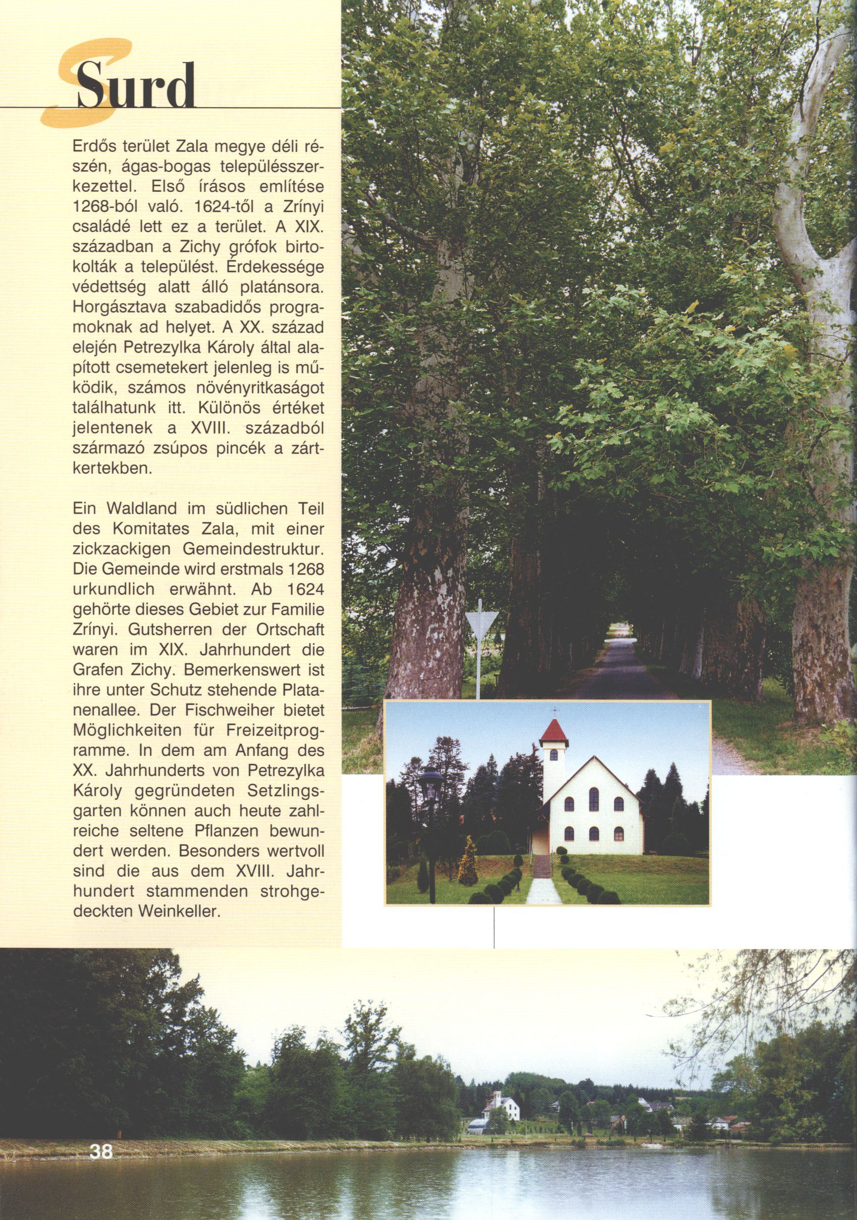 Nyilvános 2467 | 7773 | Surd | Ein Waldland im südlichen Teil des Komitates Zala, mit einer zickzackigen Gemeindestruktur. Die Gemeinde wird erstmals 1268 urkundlich erwähnt. Ab 1624 gehörte dieses Gebiet zur Familie Zrínyi. Gutsherren der Ortschaft waren im XIX. Jahrhundert die Grafen Zichy. Bemerkenswert ist ihre unter Schutz stehende Platanenallee. Der Fischweiher bietet Möglichkeiten für Freizeitprogramme. In dem am Anfang des XX. Jahrhunderts von Petrezylka Károly gegründeten Setzlingsgarten können auch heute zahlreiche seltene Pflanzen bewundert werden. Besonders wertvoll sind die aus dem XVIII. Jahrhundert stammenden strohgedeckten Weinkeller. Dieses Text stammt von: Titel: Hívogató a Régiók Kapujában - Útikönyv Látnivalók Nagykanizsán és Térségében (Einladend in dem Tor des Gebiets - Reisebuch - Sehenswürdigkeiten in Nagykanizsa und Umgebung) Herausgegeben von: Nagykanizsa és a Környező Települések Területfejlesztési Társulása (Verein für Gebietsentwicklung in Nagykanizsa und in ihrer Umgebung) 8800 Nagykanizsa, Petőfi Sándor út 5. Tel.: 06 93/536-453 • 06 93/536-454 Tel ./Fax: 06 93/326-323 E-mail: terstars@axelero.hu www.kanizsaterseg.celodin.hu |