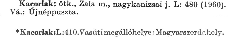 Nyilvános 2470 | 6637 | A szócikkek felismertetett szövege: | (A csillag után az 1972-es kiadású kiegészítő kötetből származó szöveg következik) Kacorlak: ötk., Zala m., nagykanizsai j. L: 480 (1960). Vá.: Újnéppuszta. *Kacorlak: L: 410. Vasúti megállóhelye: Magyarszerdahely. A szócikkek a következő lexikonból származnak: Cím: Új magyar lexikon Közreműködő: Berei Andor (1900-1979) (szerk.) Szerz. közl.: [szerk. Berei Andor et al.] Kiadás jelzés: 2. lny. Kiadás: Budapest : Akad. K., 1961-1962 Kötetei: 1., A - C 2., D - F 3., G - J 4., K - Me 5., Mf - R 6., S - Z 7. köt., A-Z Kiegészítő kötet (1972) Kiegészítő kötet, 1962÷1980 (1981) ETO jelzet: 03=945.11 Szakjelzet: 030 Cutter: U 28 Nyelv: magyar Megjegyzés: Bibliogr. a címszavak egy részének végén |
