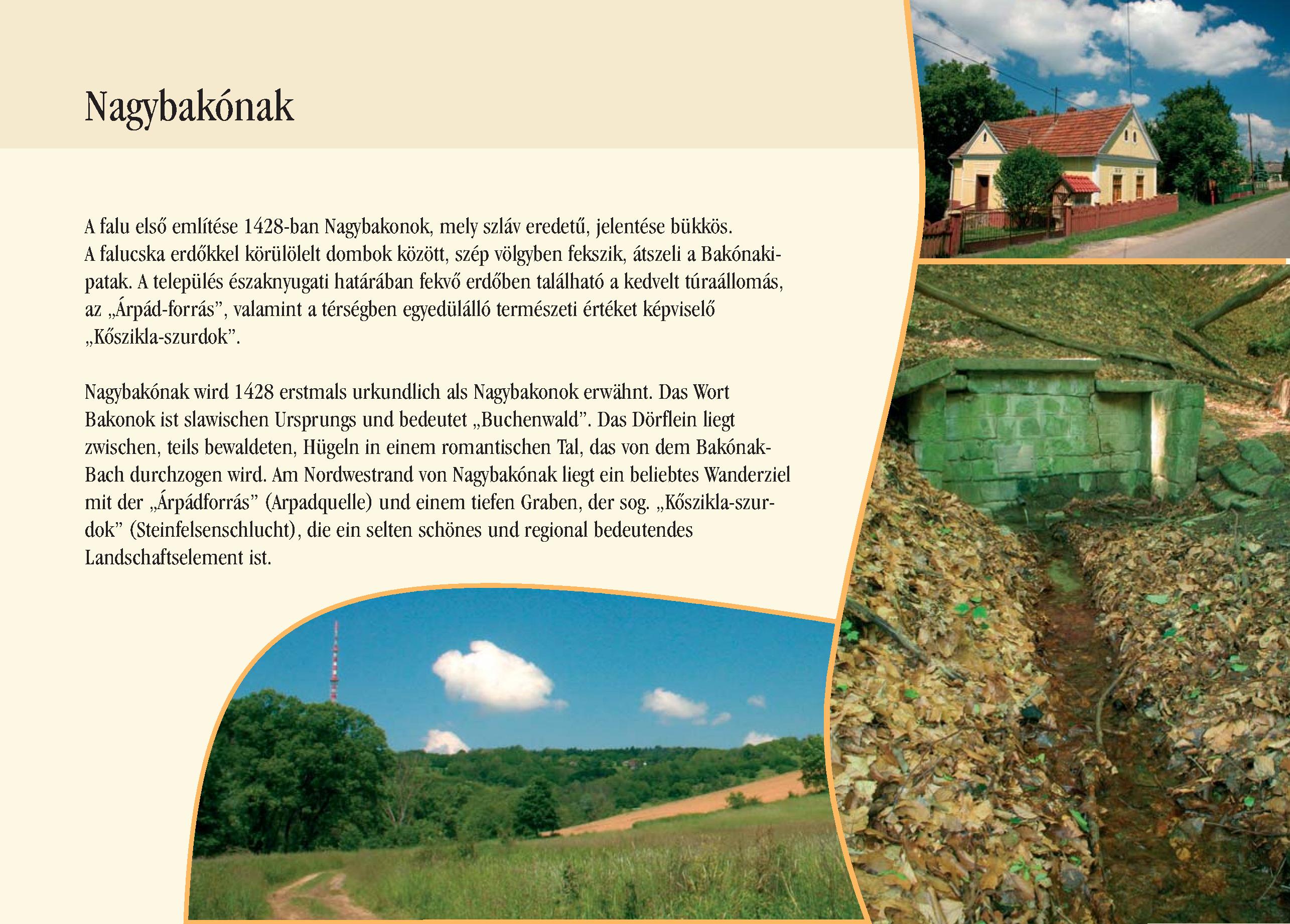 Nyilvános 2659 | 9781 | Rövid leírás | Teljes leírás (762 B) | Nagybakónak Nagybakónak wird 1428 erstmals urkundlich als Nagybakonok erwähnt. Das Wort Bakonok ist slawischen Ursprungs und bedeutet ,,Buchenwald". Das Dörflein liegt zwischen, teils bewaldeten, Hügeln in einem romantischen Tal, das von dem Bakónak-Bach durchzogen wird. Am Nordwestrand von Nagybakónak liegt ein beliebtes Wanderziel mit der ,,Árpádforrás" (Arpadquelle) und einem tiefen Graben, der sog. ,,Kőszikla-szurdok" (Steinfelsenschlucht), die ein selten schönes und regional bedeutendes Landschaftselement ist. Dieses Text stammt von: Pannonhát tájpark prospektus 2006. Web: http://www.pannonhat.hu/ (auch in Deutsch) |