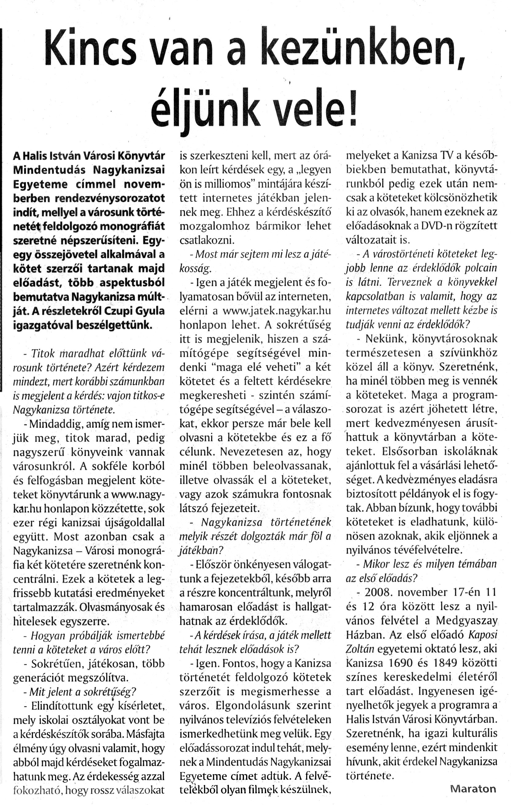 Nyilvános 2439 | 4762 | Nagykanizsai Maraton 2008. november 6. 044. szám 2. oldal - Kincs van a kezünkben, éljünk vele | A cikk szövege: Kincs van a kezünkben, éljünk vele! A Halis István Városi Könyvtár Mindentudás Nagykanizsai Egyeteme címmel novemberben rendezvénysorozatot indít, mellyel a városunk történetét feldolgozó monográfiát szeretné népszerűsíteni. Egy-egy összejövetel alkalmával a kötet szerzői tartanak majd előadást, több aspektusból bemutatva Nagykanizsa múltját. A részletekről Czupi Gyula igazgatóval beszélgettünk. - Titok maradhat előttünk városunk története? Azért kérdezem mindezt, mert korábbi számunkban is megjelent a kérdés: vajon titkos-e Nagykanizsa története. - Mindaddig, amíg nem ismerjük meg, titok marad, pedig nagyszerű könyveink vannak városunkról. A sokféle korból és felfogásban megjelent köteteket könyvtárunk a www.nagy-kar.hu honlapon közzétette, sok ezer régi kanizsai újságoldallal együtt. Most azonban csak a Nagykanizsa - Városi monográfia két kötetére szeretnénk koncentrálni. Ezek a kötetek a legfrissebb kutatási eredményeket tartalmazzák. Olvasmányosak és hitelesek egyszerre. - Hogyan próbálják ismertebbé tenni a köteteket a város előtt? - Sokrétűen, játékosan, több generációt megszólítva. - Mit jelent a sokrétűség? - Elindítottunk egy kísérletet, mely iskolai osztályokat vont be a kérdéskészítők sorába. Másfajta élmény úgy olvasni valamit, hogy abból majd kérdéseket fogalmazhatunk meg. Az érdekesség azzal fokozható, hogy rossz válaszokat is szerkeszteni kell, mert az órákon leírt kérdések egy, a „legyen ön is milliomos" mintájára készített internetes játékban jelennek meg. Ehhez a kérdéskészítő mozgalomhoz bármikor lehet csatlakozni. - Most már sejtem mi lesz a játékosság. - Igen a játék megjelent és folyamatosan bővül az interneten, elérni a www.jatek.nagykar.hu honlapon lehet. A sokrétűség itt is megjelenik, hiszen a számítógépe segítségével mindenki "maga elé veheti" a két kötetet és a feltett kérdésekre megkeresheti - szintén számítógépe segítségével - a válaszokat, ekkor persze már bele kell olvasni a kötetekbe és ez a fő célunk. Nevezetesen az, hogy minél többen beleolvassanak, illetve olvassák el a köteteket, vagy azok számukra fontosnak látszó fejezeteit. - Nagykanizsa történetének melyik részét dolgozták már föl a játékban? - Először önkényesen válogattunk a fejezetekből, később arra a részre koncentráltunk, melyről hamarosan előadást is hallgathatnak az érdeklődők. -A kérdések írása, a játék mellett tehát lesznek előadások is? - Igen. Fontos, hogy a Kanizsa történetét feldolgozó kötetek szerzőit is megismerhesse a város. Elgondolásunk szerint nyilvános televíziós felvételeken ismerkedhetünk meg velük. Egy előadássorozat indul tehát, melynek a Mindentudás Nagykanizsai Egyeteme címet adtuk. A felvételékből olyan filmek készülnek, melyeket a Kanizsa TV a későbbiekben bemutathat, könyvtárunkból pedig ezek után nemcsak a köteteket kölcsönözhetik ki az olvasók, hanem ezeknek az előadásoknak a DVD-n rögzített változatait is. - A várostörténeti köteteket legjobb lenne az érdeklődők polcain is látni. Terveznek a könyvekkel kapcsolatban is valamit, hogy az internetes változat mellett kézbe is tudják venni az érdeklődők? - Nekünk, könyvtárosoknak természetesen a szívünkhöz közel áll a könyv. Szeretnénk, ha minél többen meg is vennék a köteteket. Maga a programsorozat is azért jöhetett létre, mert kedvezményesen árusíthattuk a könyvtárban a köteteket. Elsősorban iskoláknak ajánlottuk fel a vásárlási lehetőséget. A kedvezményes eladásra biztosított példányok el is fogytak. Abban bízunk, hogy további köteteket is eladhatunk, különösen azoknak, akik eljönnek a nyilvános tévéfelvételre. - Mikor lesz és milyen témában az első előadás? - 2008. november 17-én 11 és 12 óra között lesz a nyilvános felvétel a Medgyaszay Házban. Az első előadó Kaposi Zoltán egyetemi oktató lesz, aki Kanizsa 1690 és 1849 közötti színes kereskedelmi életéről tart előadást. Ingyenesen igényelhetők jegyek a programra a Halis István Városi Könyvtárban. Szeretnénk, ha igazi kulturális esemény lenne, ezért mindenkit hívunk, akit érdekel Nagykanizsa története. Maraton |