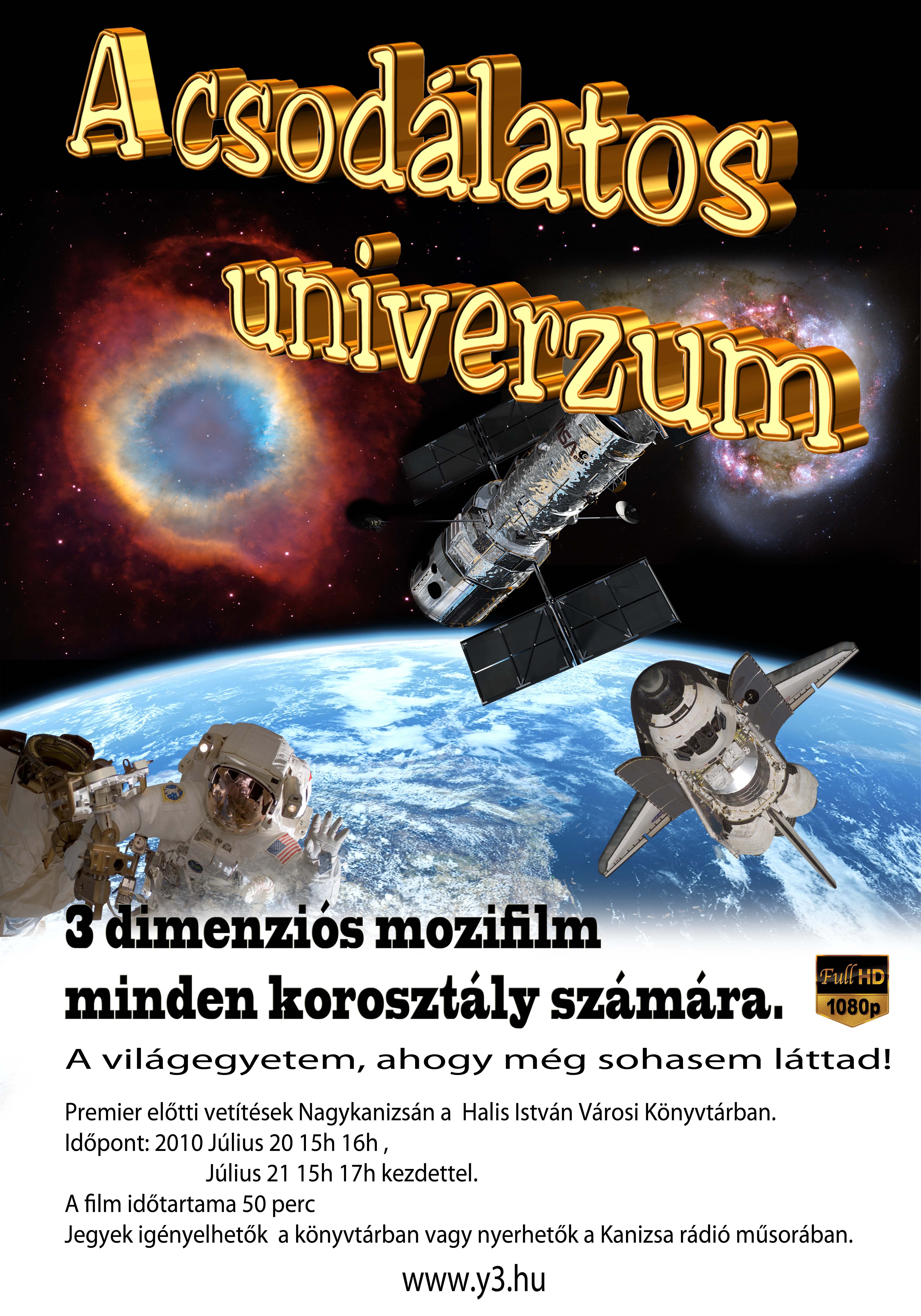Nyilvános 1567 | 4056 | Rövid leírás | Teljes leírás (495 B) | A csodálatos univerzum 3 dimenziós mozifilm minden korosztály számára. A világegyetem, ahogy még sohasem láttad! Premier előtti 3D vetítések Nagykanizsán a Halis István Városi Könyvtárban. Időpont: 2010. július 20. 15h 16h, július 21. 15h 17h kezdettel. A film időtartama 50 perc. Jegyek igényelhetők a könyvtárban vagy nyerhetők a Kanizsa rádió műsorában. www.y3.hu Full HD 1080p |