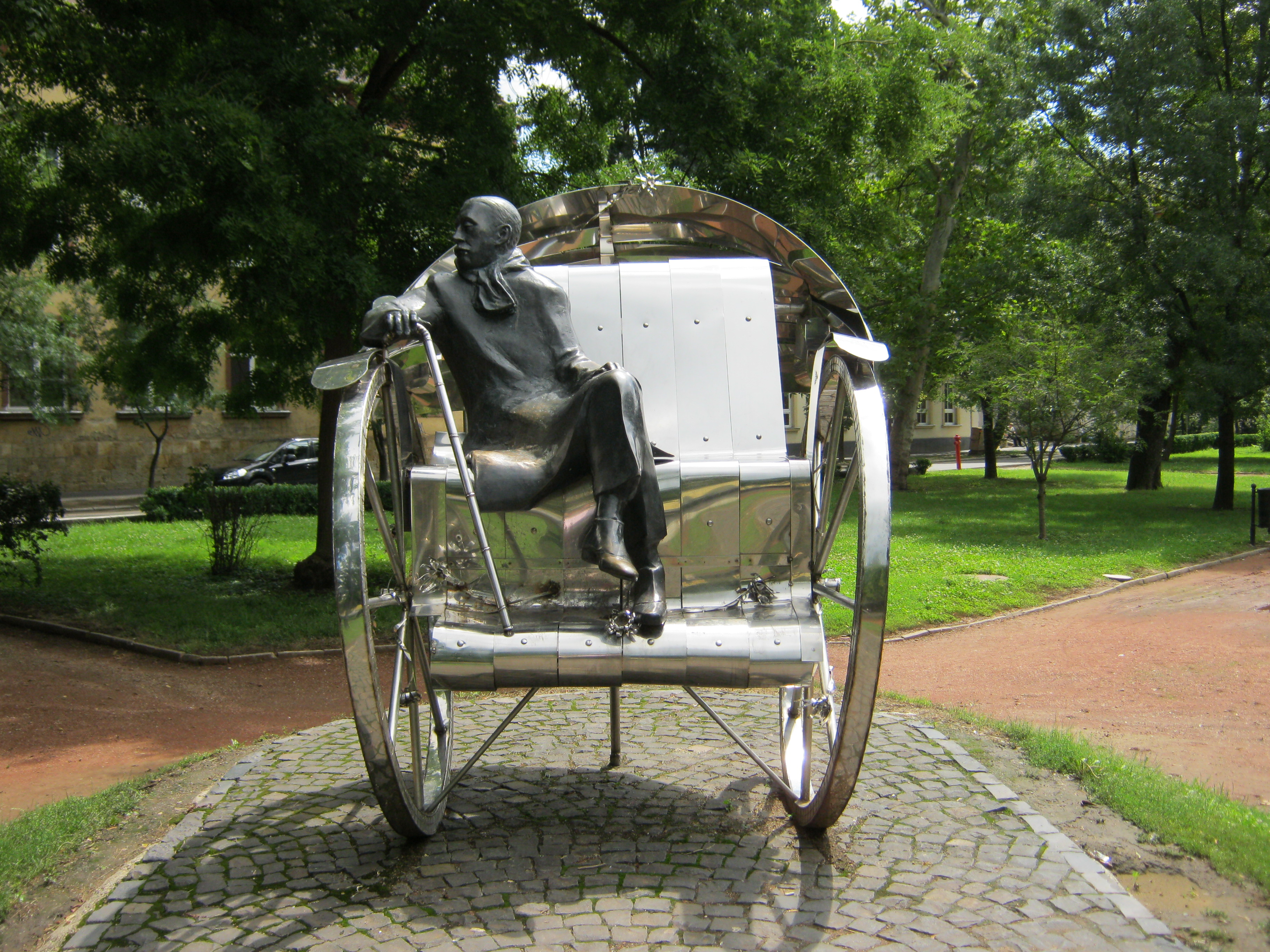 Nyilvános 1081 | 3245 | Nyíregyháza, Bessenyei tér: Krúdy Gyula szobra | A Bessenyei téren 2003-ban avatták fel Varga Imre "Hazatérés" című, Krúdy Gyulának emléket állító szoborkompozícióját. Az alkotást Krúdy: A vörös postakocsi című regénye ihlette. Krúdy Nyíregyházán született (lásd: Nyíregyháza, Szent István utca 8.) és itt végezte a gimnázium (lásd: Nyíregyháza, Szent István u. 17-19.) felsőbb osztályait. A fénykép 2010 augusztus elején készült. |
