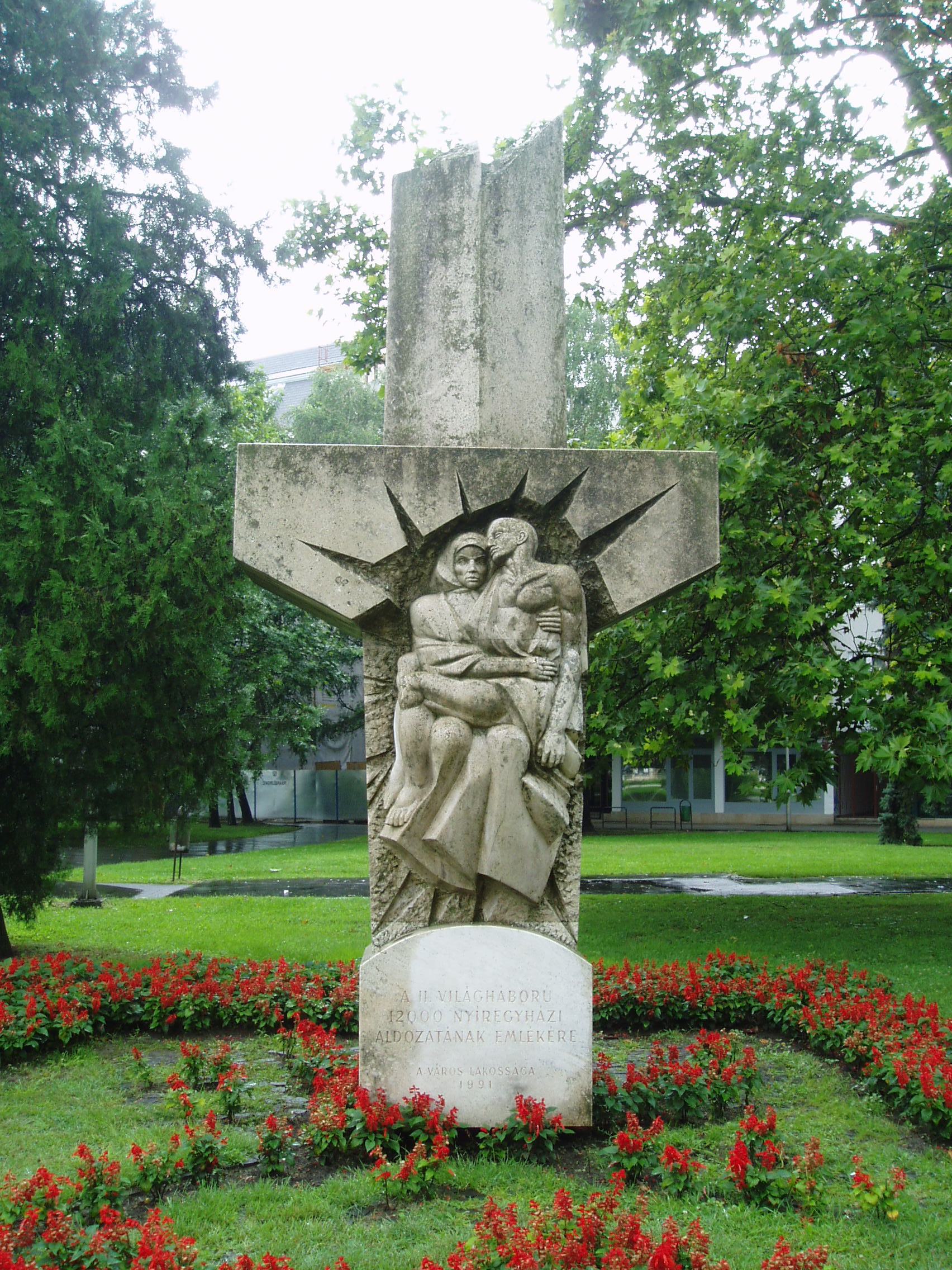Nyilvános 1089 | 1945 | Nyíregyháza, Országzászló tér: A II. világháború nyíregyházi áldozatai | A szépen kialakított parkban 1991-ben helyezték el a második világháború nyíregyházi áldozatainak kőből faragott, kereszt alakú emlékművét. Gyurcsek Ferenc alkotását Antall József miniszterelnök avatta fel. Felh. irod.: www.szoborlap.hu A fénykép 2010 augusztus elején készült. |