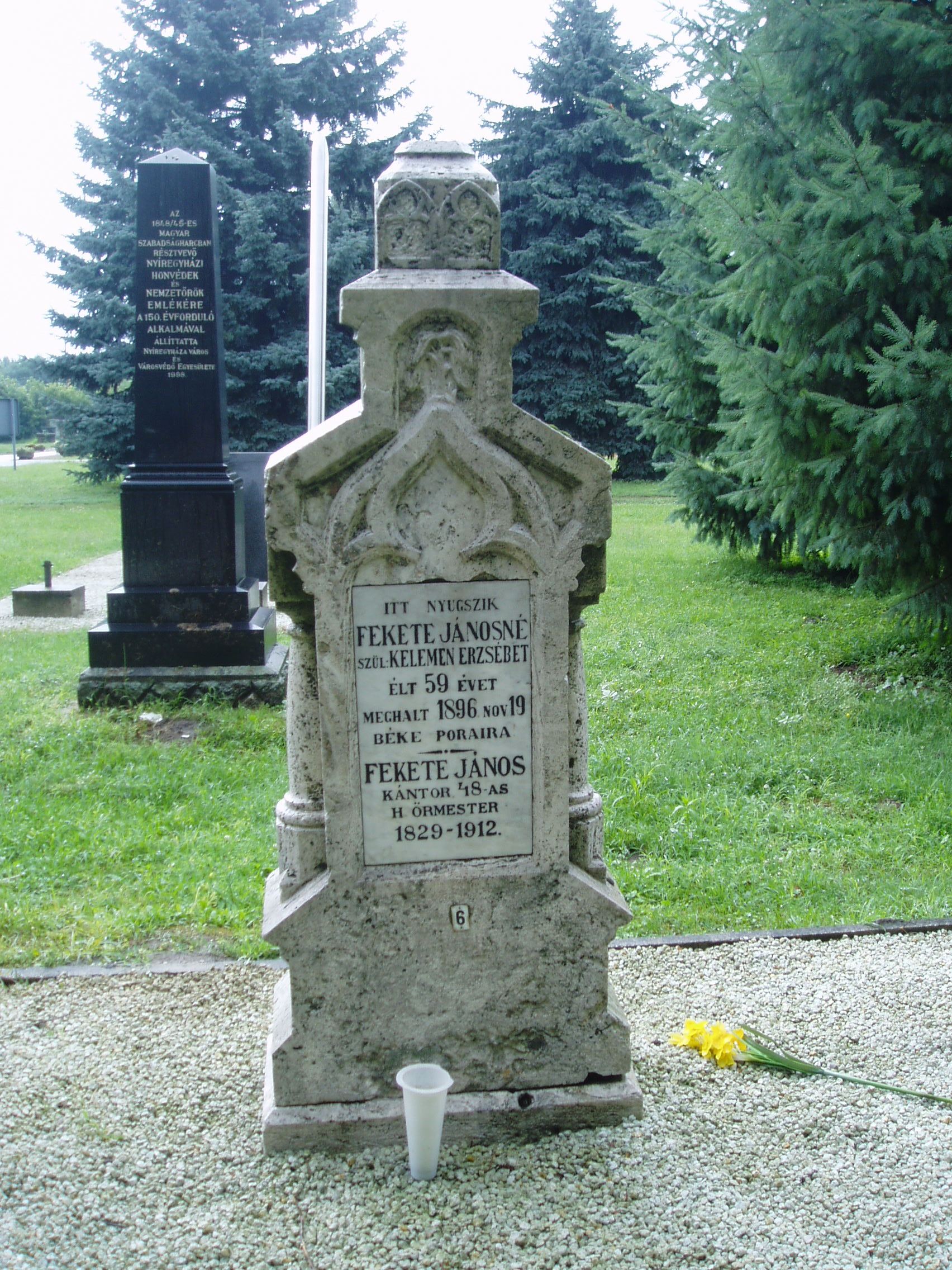 Nyilvános 1110 | 1723 | Nyíregyháza, Pazonyi tér, Északi temető: Fekete János | A Dózsa György út vezet Nyíregyháza Északi temetőjébe. A ravatalozó közelében, a díszsírhelyek között találjuk Fekete János (1829-1912) kántor, 1848-as honvéd őrmester sírkövét. Felh. irod.: Fazekas Árpád - Szekrényes András: Nyíregyháza temetői. Nyíregyháza, 1990 A fénykép 2010 augusztus elején készült |