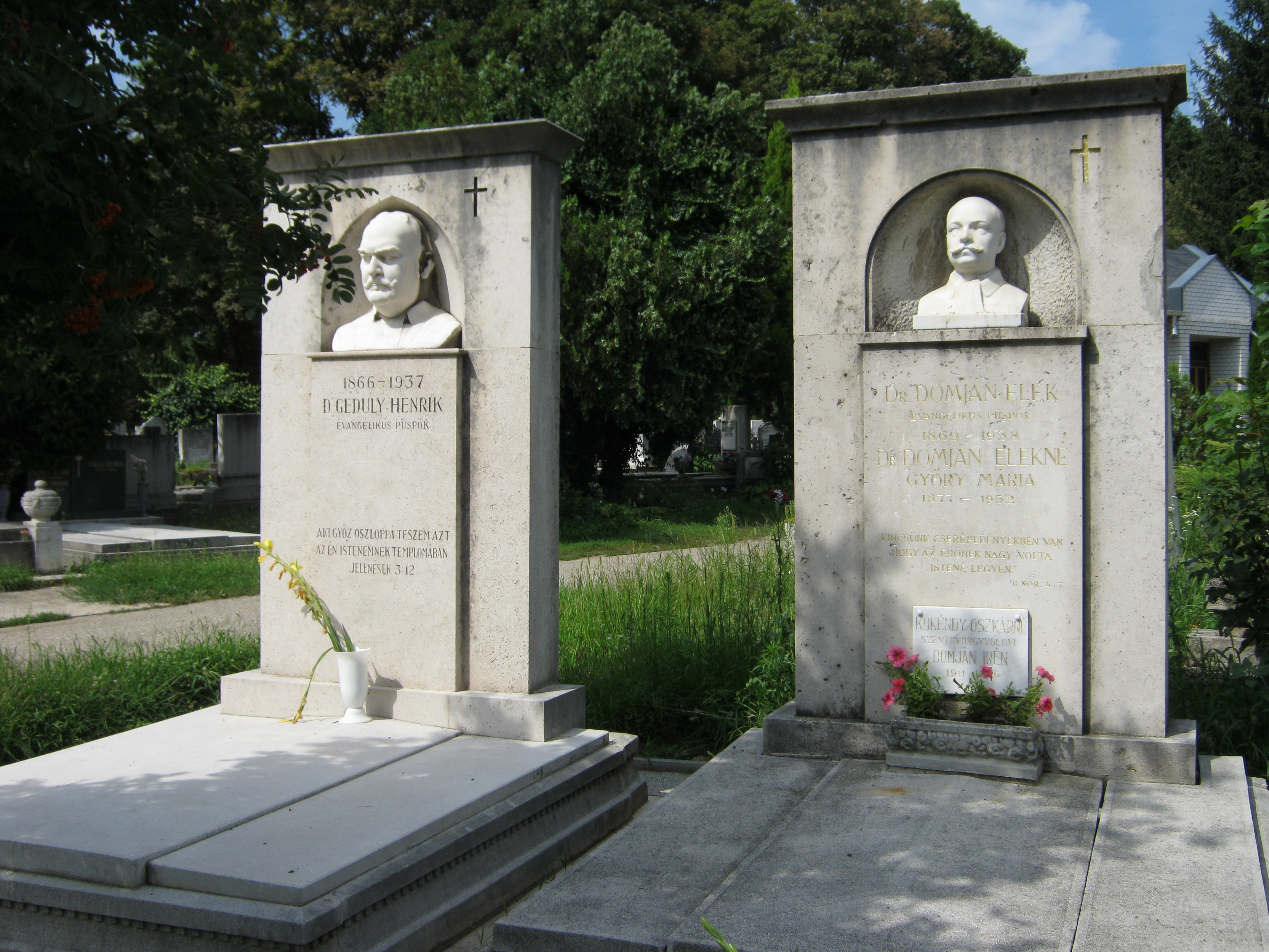 Nyilvános 1100 | 3093 | Nyíregyháza, Pazonyi tér, Északi temető: Geduly Henrik és Domján Elek | A Dózsa György út vezet Nyíregyháza Északi temetőjébe. A ravatalozó mögötti díszsírhelyen nyugszik Nyíregyháza két kiváló személyisége, evangélikus püspöke, dr. Geduly Henrik (1866-1937) és dr. Domján Elek (1869-1928). Felh. irod.: Fazekas Árpád - Szekrényes András: Nyíregyháza temetői. Nyíregyháza, 1990 A fénykép 2010 augusztus elején készült |