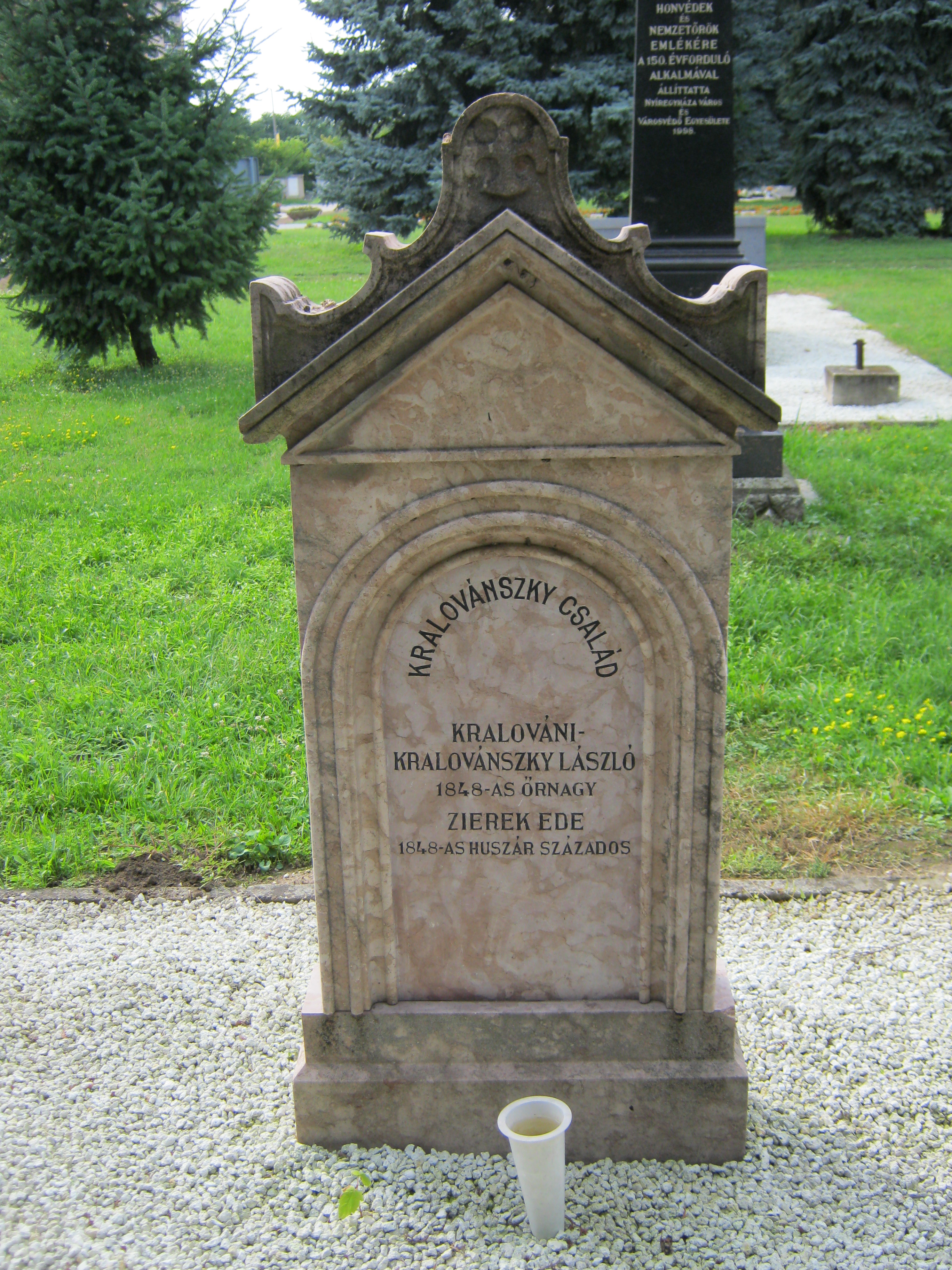 Nyilvános 1051 | 2295 | Nyíregyháza, Pazonyi tér, Északi temető: Kralovánszky László | A Dózsa György út vezet Nyíregyháza Északi temetőjébe. A díszsírhelyek sorában található a Kralovánszky család legfiatalabb fiának, Lászlónak sírköve. A Kralovánszky család kiemelkedő tevékenysége az 1848-as szabadságharchoz kötődik. Országosan is egyedülálló, hogy egy családnak hét tagja aktív részese volt a történelmi időknek és valamennyien tiszti rangot kaptak. Az apa őrnagy, hat gyermeke - köztük László - százados volt. (A családi sírbolt is ebben a temetőben van, sajnos, nem sikerült ráakadnom - K.K.) Felh. irod.: Fazekas Árpád - Szekrényes András: Nyíregyháza temetői. Nyíregyháza, 1990 A fénykép 2010 augusztus elején készült |