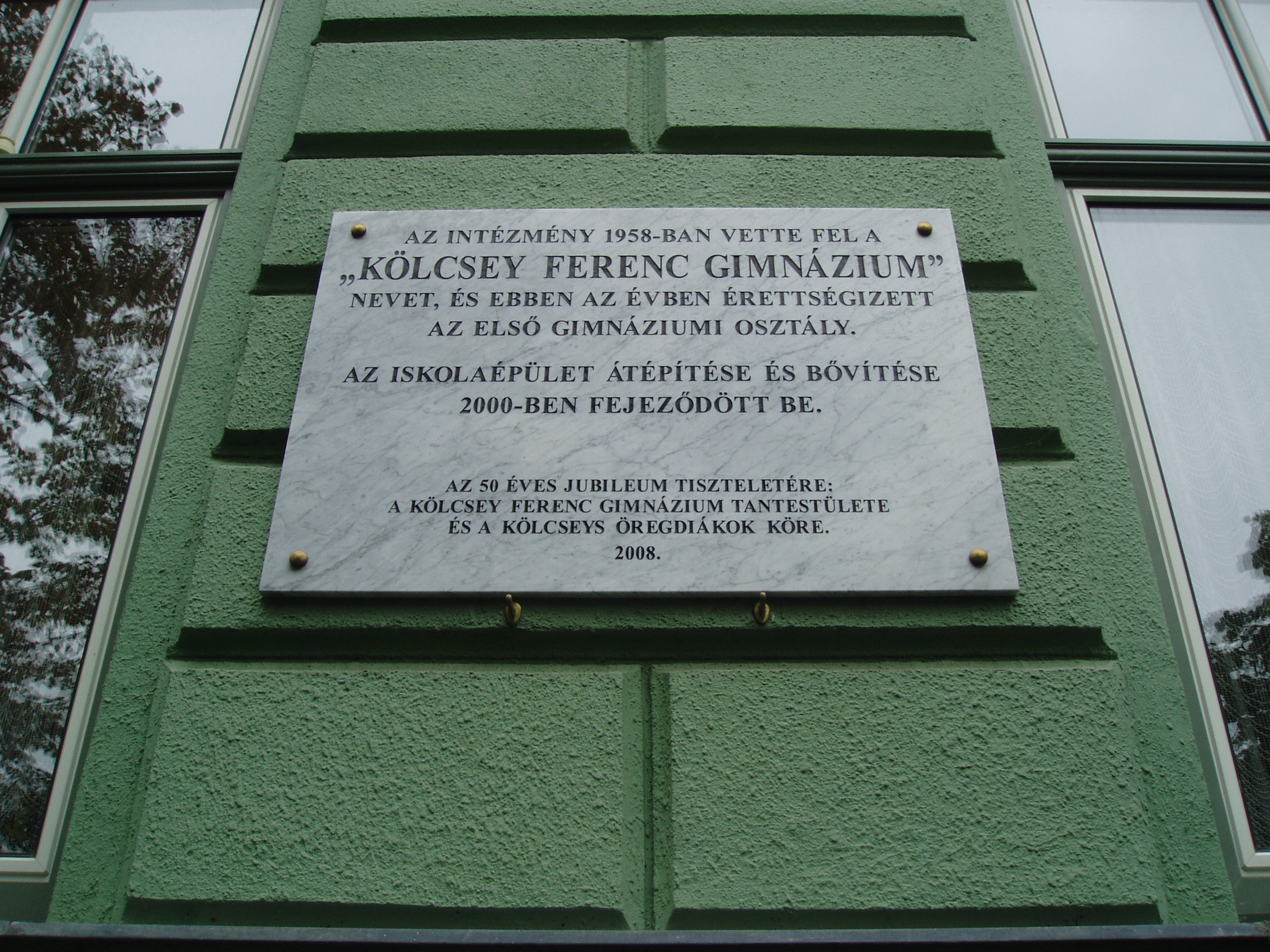 Nyilvános 1025 | 1437 | Nyíregyháza, Széchenyi utca 6. Kölcsey Ferenc Gimnázium | Épületét 1901-ben, Barzó Mihály tervei alapján, pénzügyigazgatósági székháznak emelték. 1925-től, 1957-ben történt megszűnéséig középfokú tanítóképző intézetként működött. Azóta a Kölcsey gimnázium otthona. Az első gimnáziumi osztály 1954/55-ben még egy korábbi épületben kezdte meg a tanulást, de már itt érettségizett 1959-ben. Az iskolaépület homlokzatán több emléktábla idézi az egykori tanítóképző, majd gimnázium neves tanárainak és diákjainak alakját. Felh. irod.: www.kolcsey-nyh.sulinet.hu A fénykép 2010 augusztus elején készült |